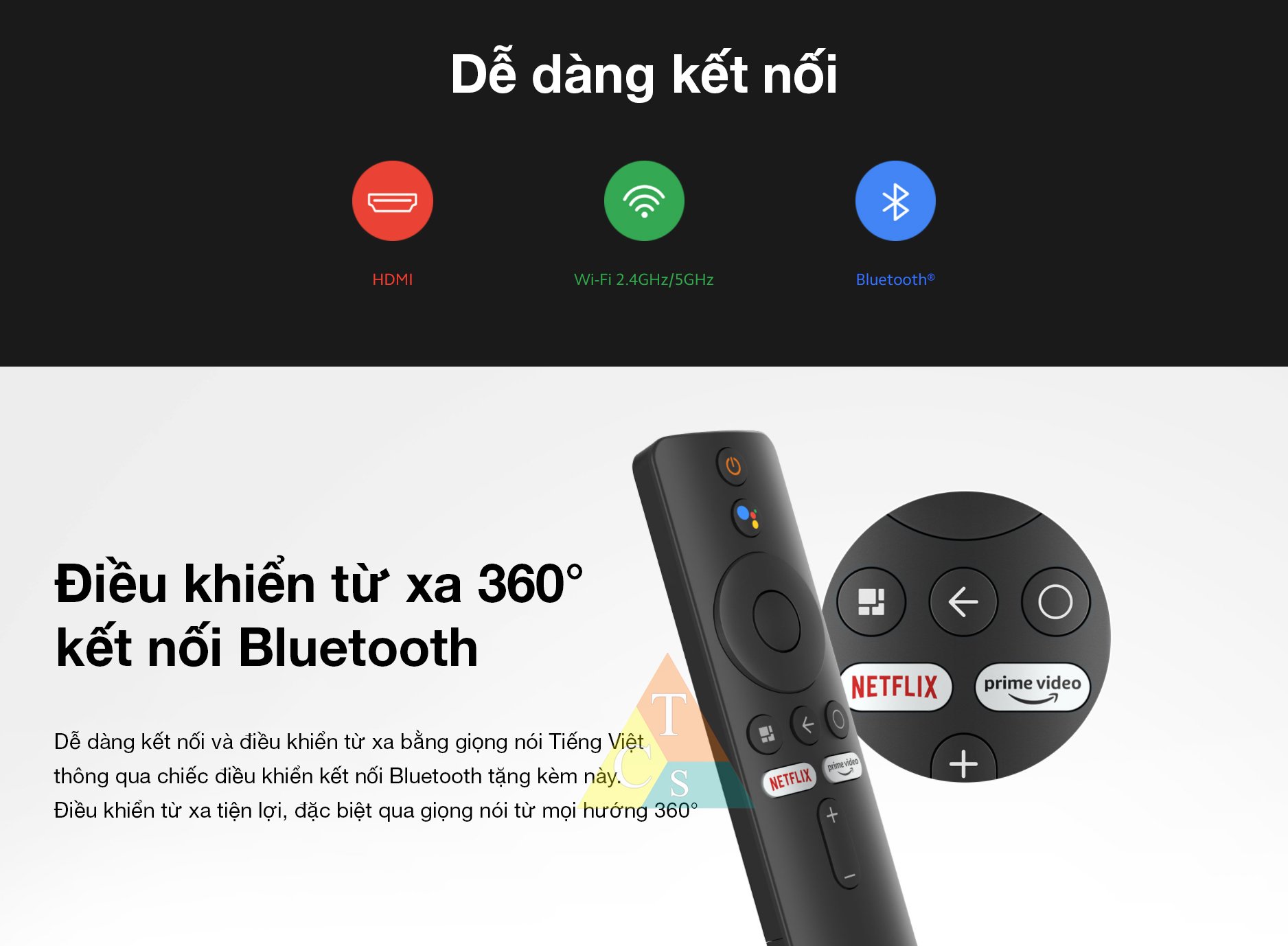 Thao tác đơn giản, dễ dàng với chỉ 3 bước: Cắm Xiaomi Android TV Box 4K vào tivi, kết nối wifi, trải nghiệm các ứng dụng. Hỗ trợ kết nối Bluetooth 5.2, wifi chuẩn 802.11a/b/g/n/ac 2.4GHz/5GHz ổn định.