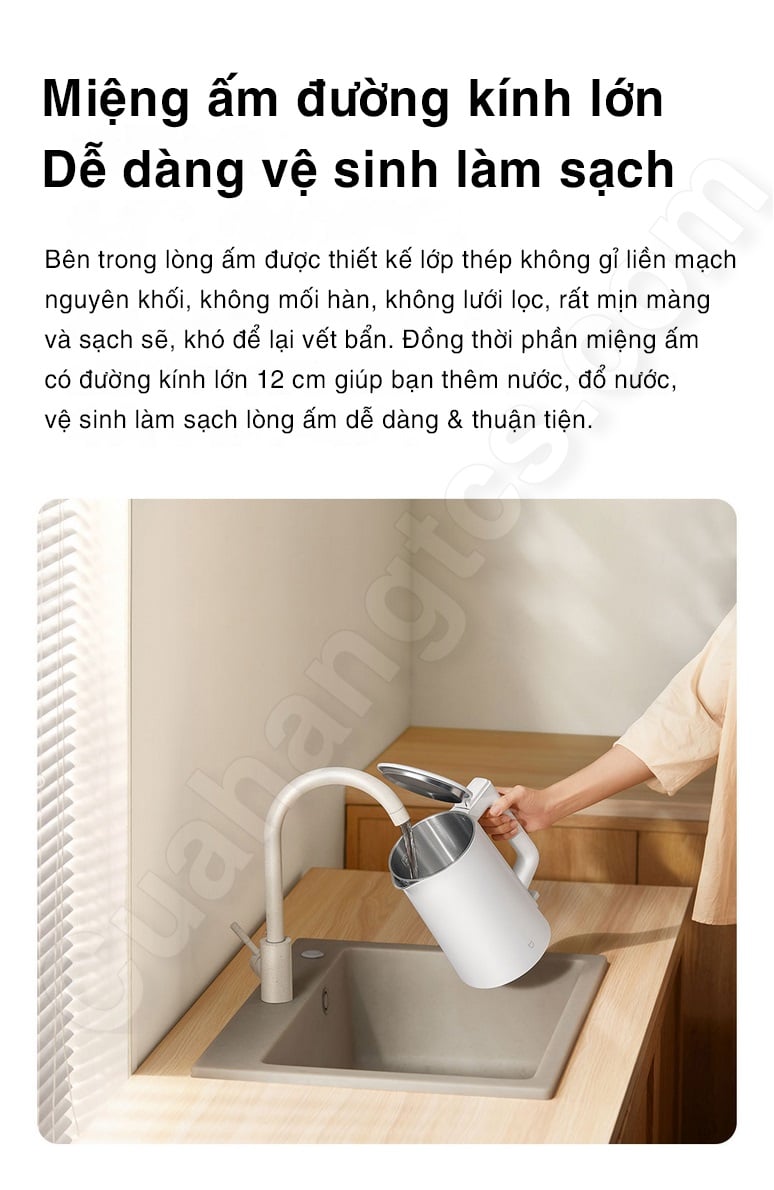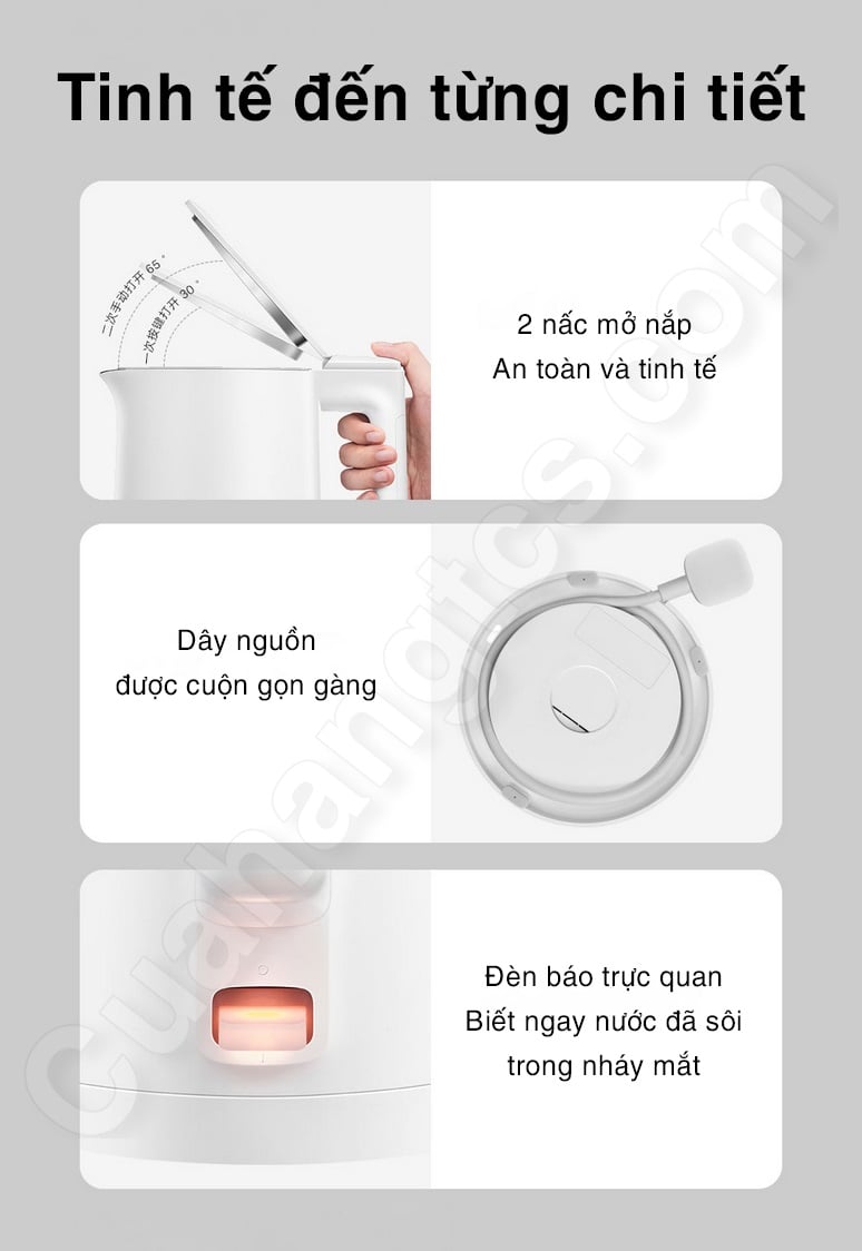 Ấm có thiết kế nắp mở giảm chấn hai tầng giúp hơi nước không bị phun ra ngoài. Thân ấm có đường kính lớn 12 cm dễ dàng vệ sinh, vòi tròn hình chữ U giúp nước nóng không bị bắn tung tóe. Đáy ấm có ngăn đựng dây nguồn và đèn sưởi.