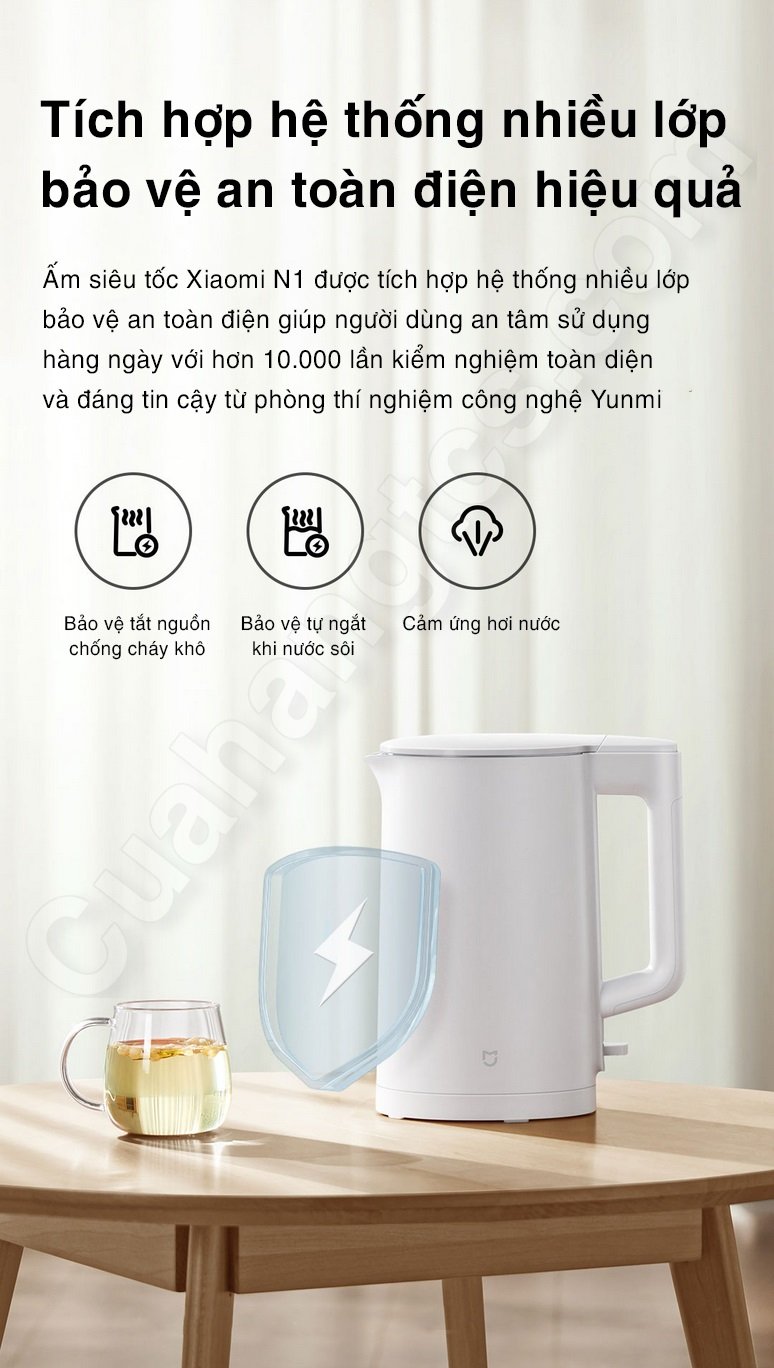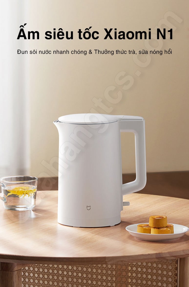 Bình đun siêu tốc Mijia Electric Kettle N1 có model MJDSH05YM, có dung tích 1.5 lít, có hệ thống làm nóng vòng tập trung 360° công suất cao 1500W, vượt qua bài kiểm tra tuổi thọ hơn 10,000 lần.