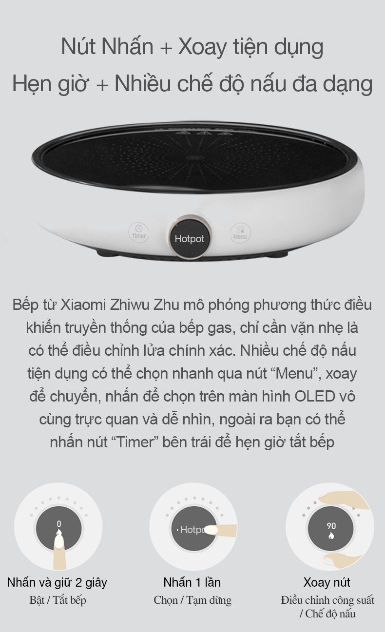 Xiaomi Zhiwuzhu Induction Cooker mô phỏng phương thức điều khiển truyền thống của bếp gas, chỉ cần vặn nhẹ là có thể điều chỉnh lửa chính xác. Nhiều chế độ nấu tiện dụng có thể chọn nhanh qua nút ”mennu”, xoay để chuyển, nhấn để chọn trên màn hình oled vô cùng trực quan và dễ nhìn. Ngoài ra bạn có thể nhấn nút ”Timer” bên trái để hẹn giờ tắt bếp.
