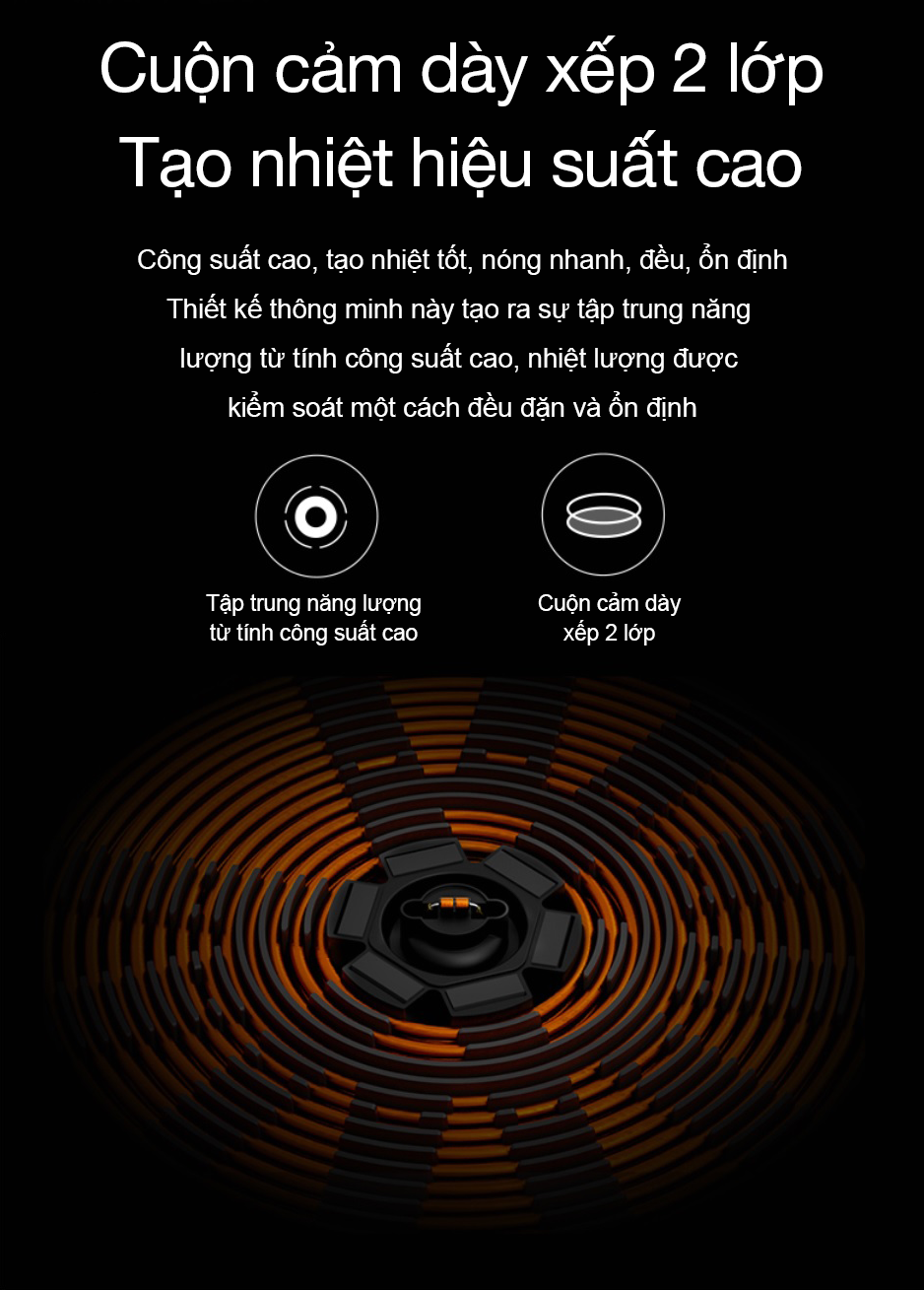 Bếp từ Zhiwuzhu Xiaomi được cấu tạo từ cuộn cảm nhiệt dày xếp 2 lớp, tạo nhiệt với hiệu suất cao, nóng nhanh, đều và ổn định. Thiết kế thông minh này tạo ra sự tập trung năng lượng từ tính công suất cao, nhiệt lượng được kiểm soát 1 cách đều đặn và ổn định.
