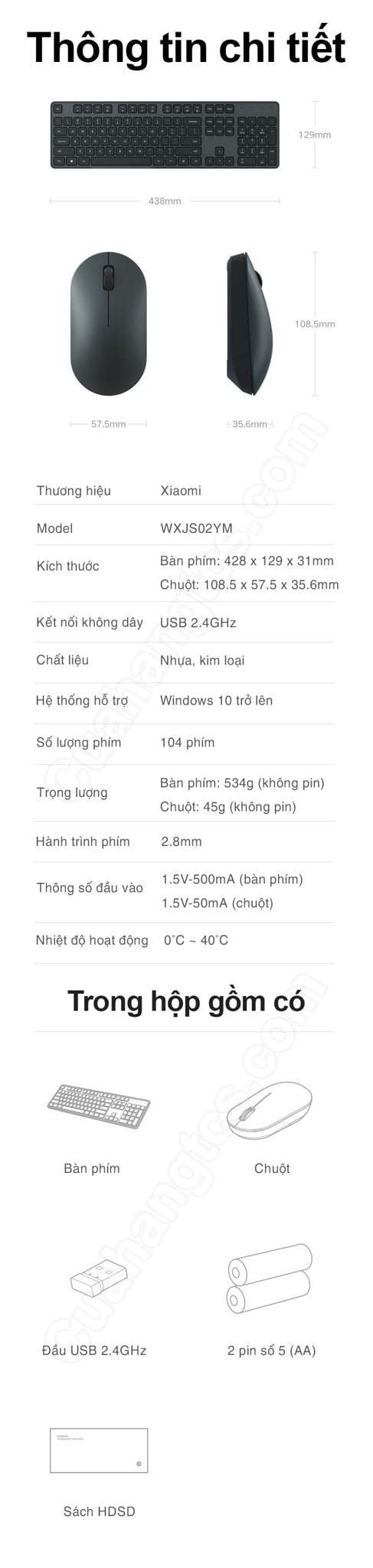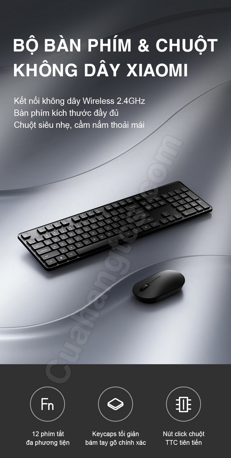 Bộ bàn phím chuột không dây Xiaomi gen 2 có SKU BHR6941CN thiết kế không dây 2.4GHz với tín hiệu truyền ổn định, 104 phím bấm, chuột cho cảm biến chính xác 1000DPI, chuột kết cấu khá gọn nhẹ chỉ khoảng 60g