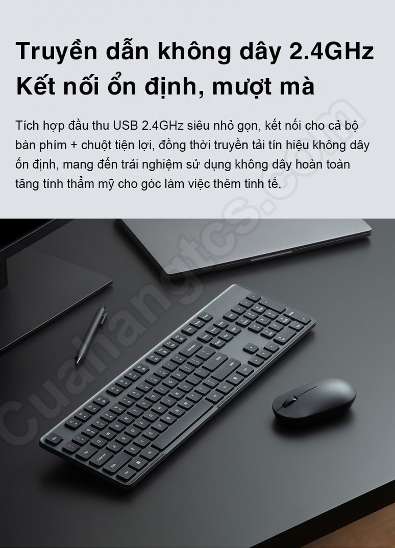 Bộ bàn phím Xiaomi Gen 2 sử dụng kết nối không dây 2.4GHz vô cùng ổn định với bộ thu USB. Không cần các thao tác kết nối, cắm dây phức tạp, rườm rà, người dùng chỉ cần cắm bộ thu để kết nối bàn phím với chuột cùng lúc và sử dụng. Với phương thức kết nối không dây hiện đại, bạn hoàn toàn có thể linh hoạt sử dụng bàn phím ở mọi lúc mọi nơi với nhiều vị trí và không gian khác nhau.