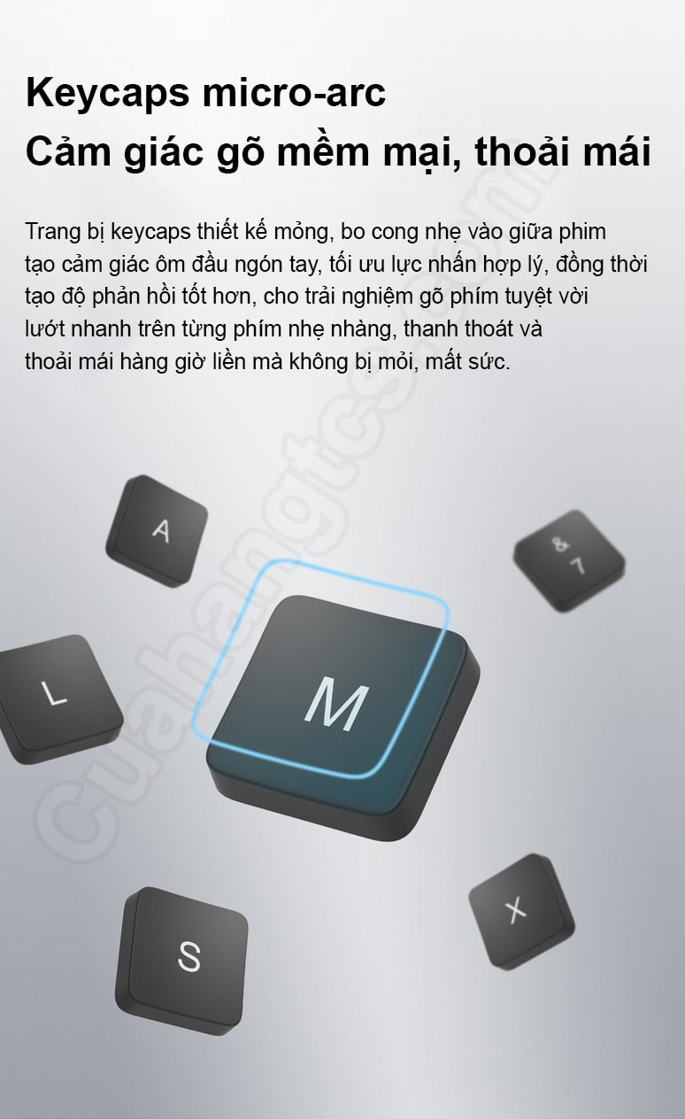 Thiết kế các phím bấm với bề mặt hơi cong sẽ phù hợp hơn với dạng vòng cung của đầu ngón tay cho cảm giác bấm thoải mái và linh hoạt. Các kí tự được khắc laser rõ ràng, sắc nét chống mài mòn tốt. Hơn nữa bàn phím không dây Xiaomi cũng được thiết kế với góc nghiêng 6 độ phù hợp hơn với góc đặt của lòng bàn tay và cổ tay, mang đến tư thế bấm thoải mái và tự do, ít bị mỏi hơn cho người dùng.