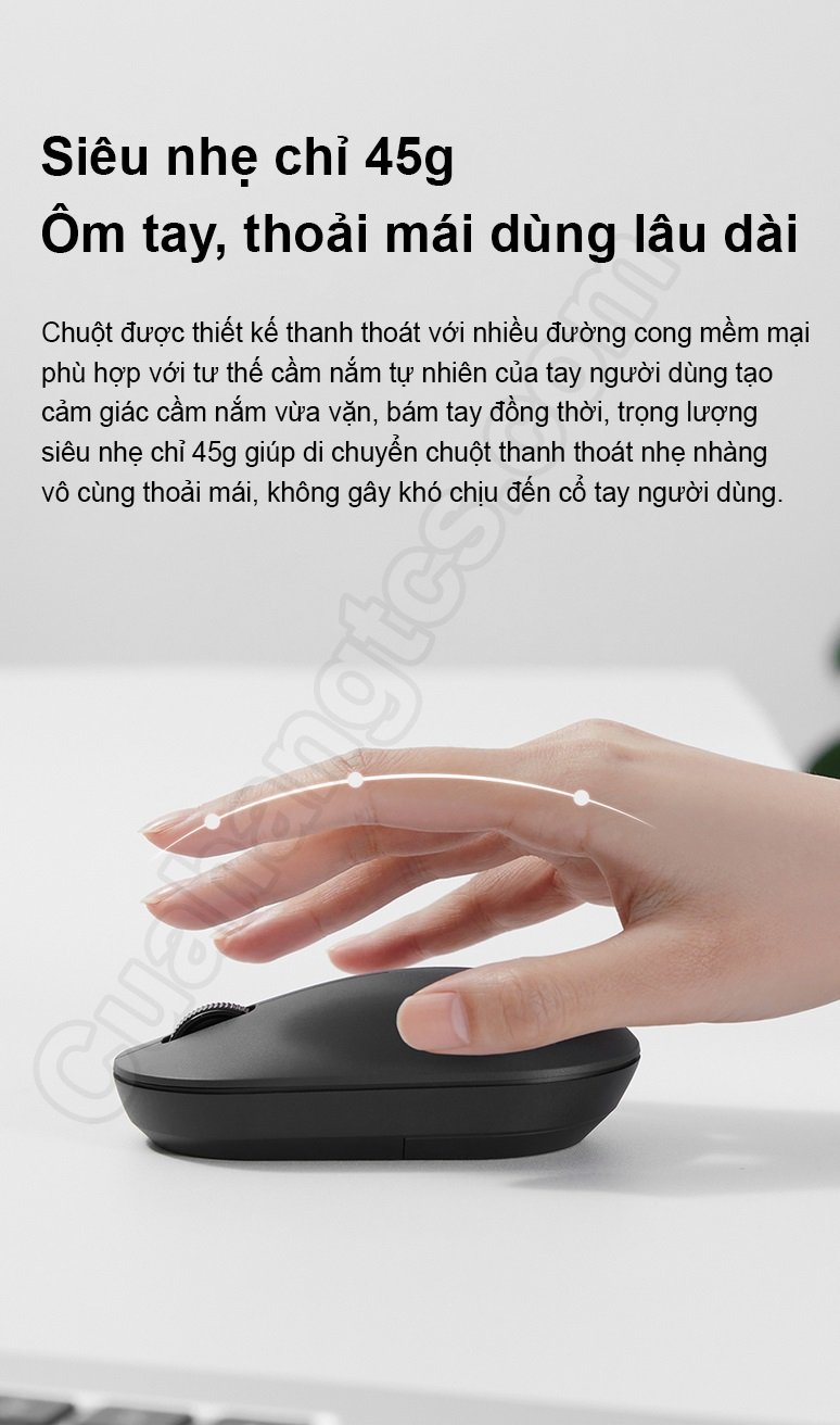 Thiết kế đường cong của chuột không dây Xiaomi thích ứng với các kích cỡ lòng bàn tay khác nhau, mang đến cảm giác cầm vừa tay, thoải mái. Kết cấu khá gọn nhẹ của chuột chỉ nặng 45g (chưa bao gồm pin), nhẹ hơn rất nhiều so với con chuột của thế hệ đầu (60g). Điều này sẽ giúp bạn di chuột nhẹ nhàng, dễ dàng kiểm soát các chuyển động, định vị, giảm tối đa áp lực lên ngón tay và cổ tay, tránh gây mỏi khi sử dụng trong thời gian dài.