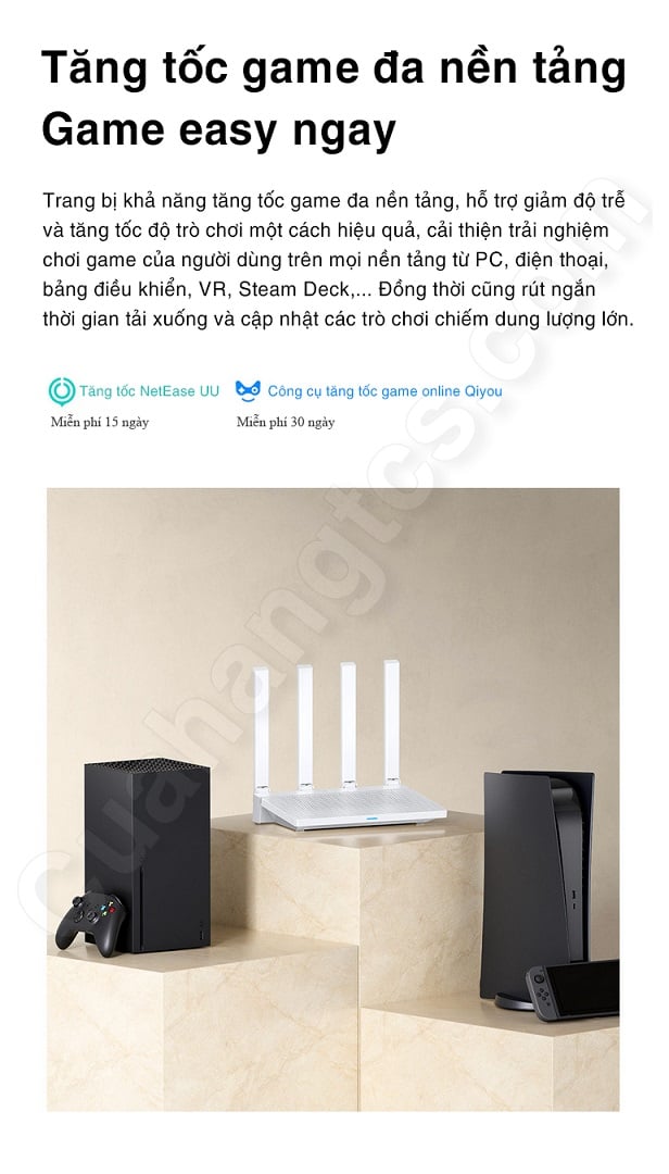 Bên cạnh khả năng cung cấp đường truyền mạng tốc độ cao với vùng phủ sóng rộng và nhiều thiết bị cùng lúc. Tính năng của router Wifi Gaming Xiaomi cũng cực kỳ mạnh, mang lại các trải nghiệm sử dụng thoải mái cho người dùng. Cụ thể, sản phẩm được trang bị khả năng tăng tốc game đa nền tảng, hỗ trợ giảm độ trễ và tăng tốc độ trò chơi một cách hiệu quả, cải thiện trải nghiệm chơi game của người dùng trên mọi nền tảng từ PC, điện thoại, bảng điều khiển, VR, Steam Deck,… Đồng thời cũng rút ngắn thời gian tải xuống và cập nhật các trò chơi chiếm dung lượng lớn.