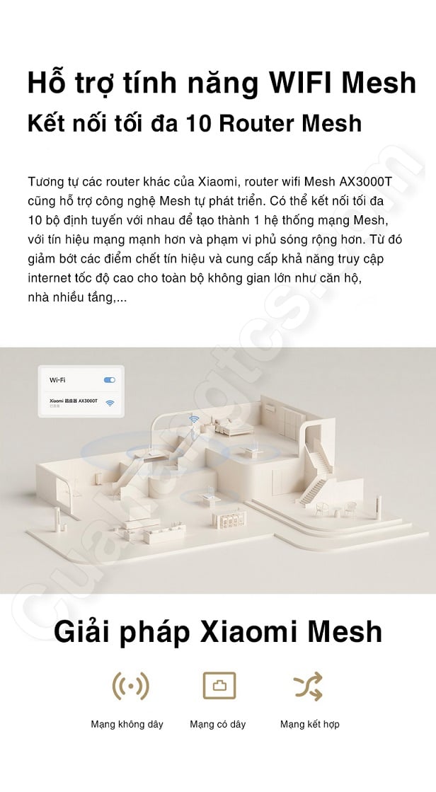 Tương tự các router khác của Xiaomi, router wifi Mesh AX3000T cũng hỗ trợ công nghệ Mesh tự phát triển. Có thể kết nối tối đa 10 bộ định tuyến với nhau để tạo thành 1 hệ thống mạng Mesh, với tín hiệu mạng mạnh hơn và phạm vi phủ sóng rộng hơn. Từ đó giảm bớt các điểm chết tín hiệu và cung cấp khả năng truy cập internet tốc độ cao cho toàn bộ không gian lớn như căn hộ, nhà nhiều tầng,…