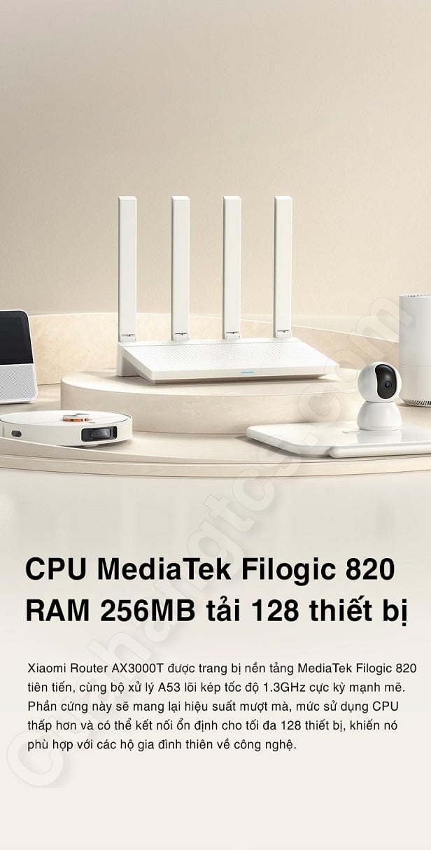 Xiaomi Router AX3000T được trang bị nền tảng MediaTek Filogic 820 tiên tiến, cùng bộ xử lý A53 lõi kép tốc độ 1.3GHz cực kỳ mạnh mẽ. Phần cứng này sẽ mang lại hiệu suất mượt mà, mức sử dụng CPU thấp hơn và có thể kết nối ổn định cho tối đa 128 thiết bị, khiến nó phù hợp với các hộ gia đình thiên về công nghệ.