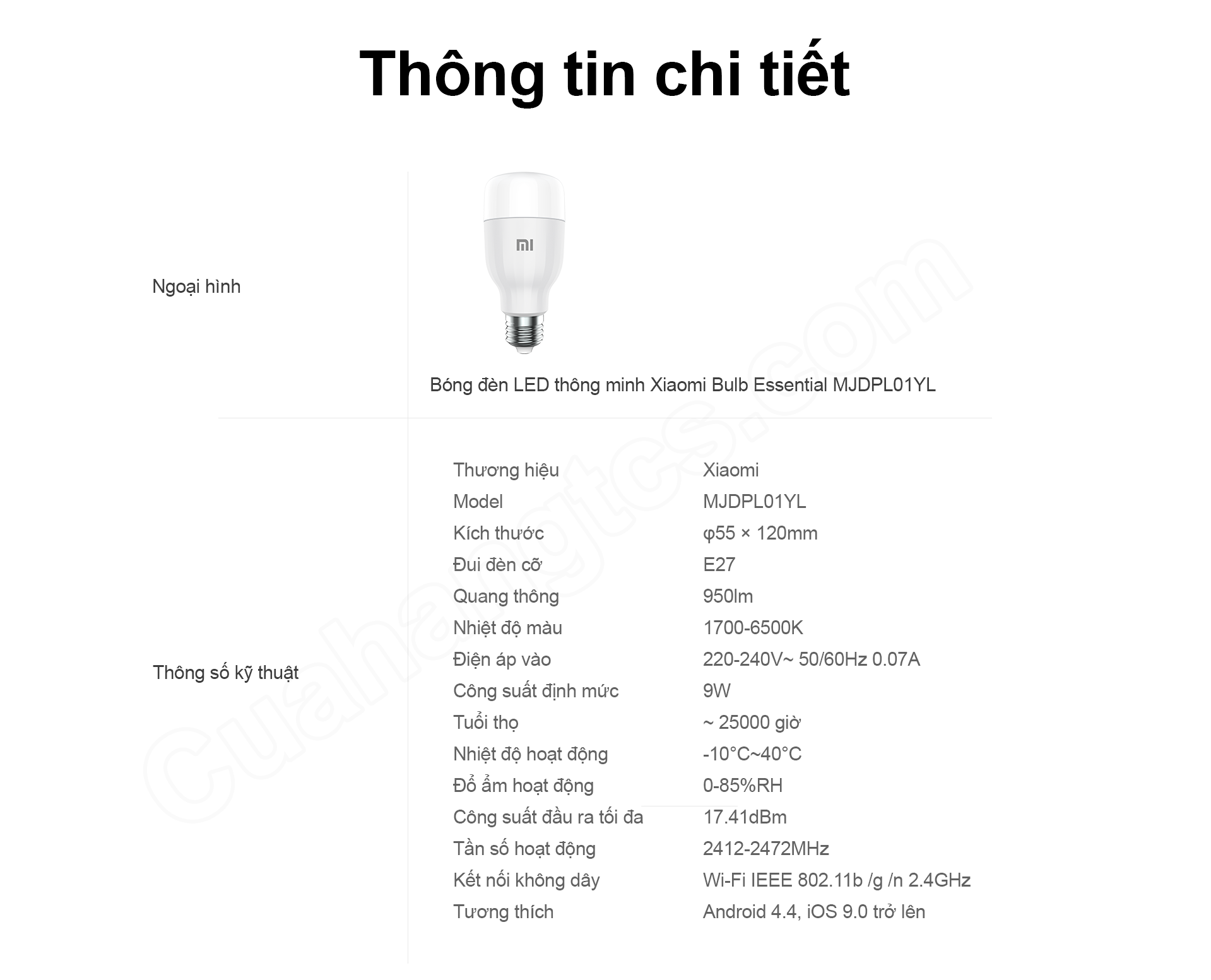Bóng đèn LED thông minh Xiaomi Bulb Essential MJDPL01YL hoạt động với công suất chỉ 9W nhưng cho độ sáng đạt đến 950 lumens, tương đương với đèn sợi đốt thông thường 69W. Bên cạnh đó, bóng đèn còn cung cấp dải nhiệt độ màu lớn từ 1700-6500K với khả năng hiển thị đến 16 triệu màu khác nhau, giúp người dùng thoải mái điều chỉnh bất kỳ độ sáng và nhiệt độ màu tùy theo ý thích của mình.