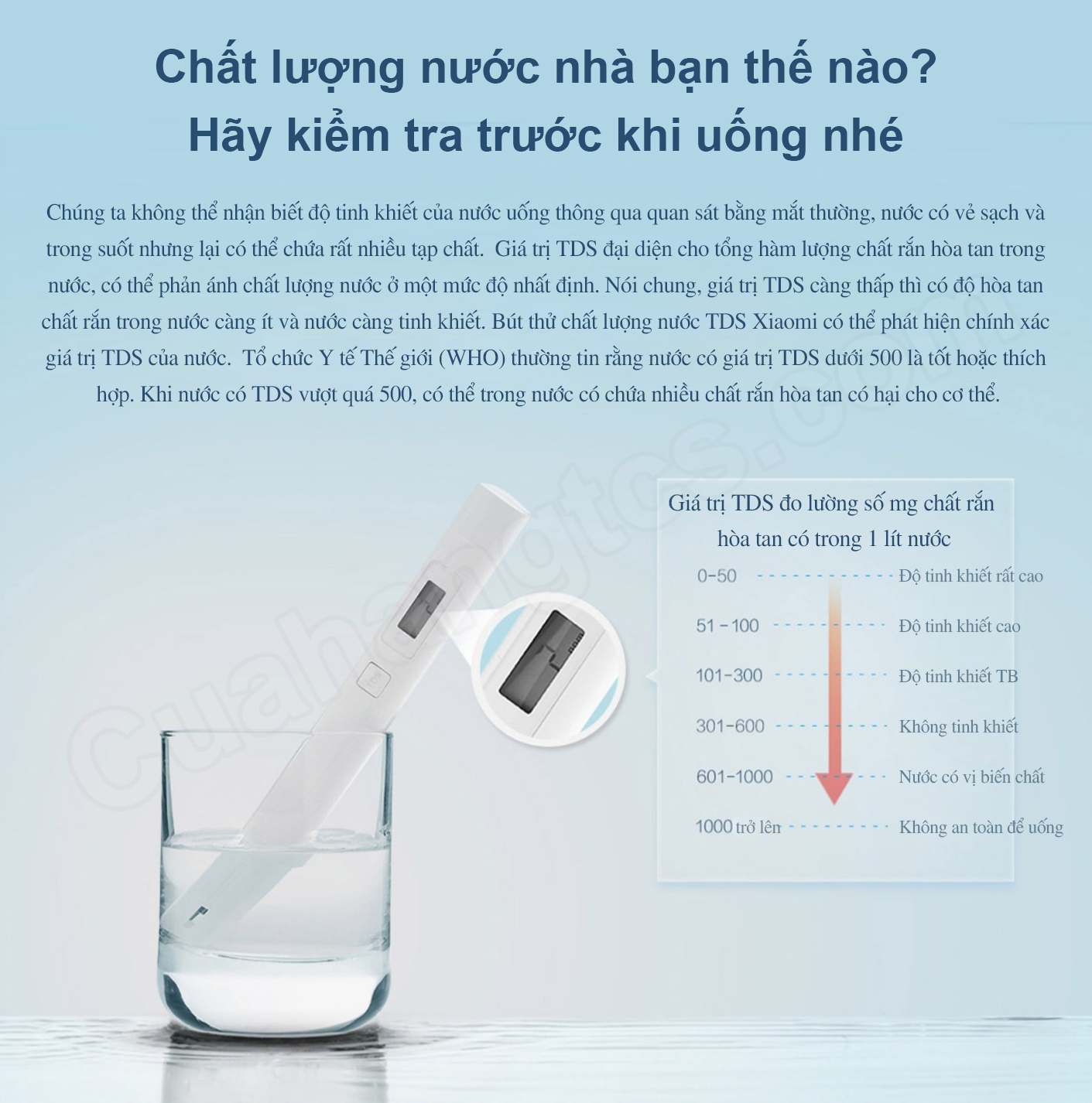 Mi TDS Pen Water Quality Tester là thiết bị đo tổng hàm lượng chất rắn hòa tan trong nước, nước có chỉ số bao nhiêu là uống được, bao nhiêu là nước bẩn…