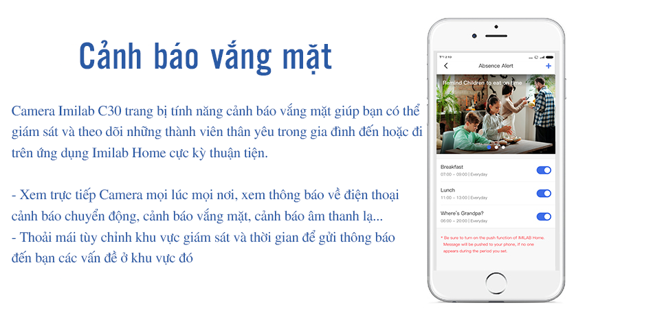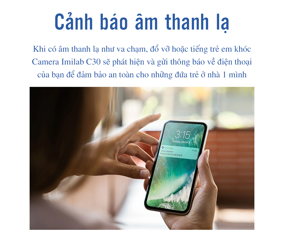 Khi có âm thanh lạ như va chạm, đổ vỡ hoặc tiếng trẻ em khóc, Camera ip C30 Imilab sẽ phát hiện và gửi thông báo về điện thoại của bạn để đảm bảo an toàn cho những đứa trẻ ở nhà 1 mình.