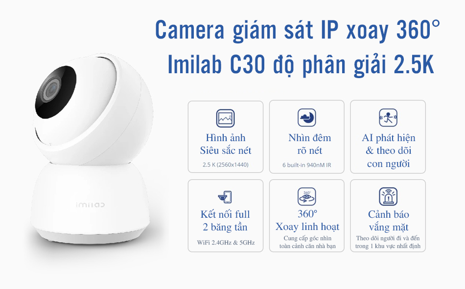 Camera ip Imilab C30 Bản Quốc Tế Xiaomi model CMSXJ21E với độ phân giải 2.5K 1440p sắc nét 2560×1440, với khả năng xoay 360° cho quan sát không góc chết, ống kính khẩu độ F1.4 cho khả năng quay đêm tốt, kết nối thông minh qua APP Imilab Home…