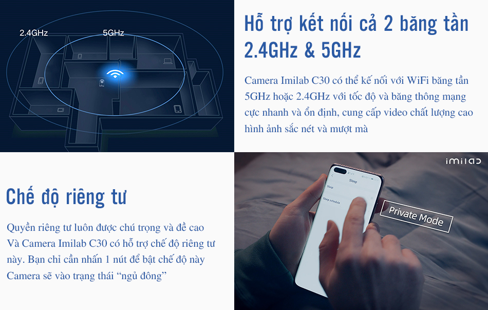 Xiaomi Imilab C30 CMSXJ21E so với các dòng camera phổ thông khác, được nâng cấp cho phép kết nối với băng tần wifi 5Ghz. Việc này cho phép camera có 1 kết nối ổn định hơn, mượt mà hơn ngay cả khi xem trực tiếp ở chế độ QHD 2.5K.