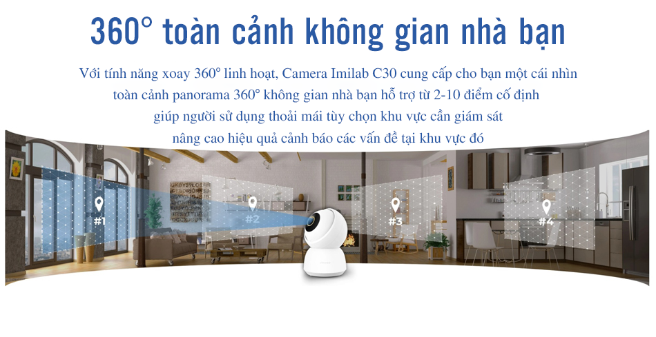 Camera ip Imilab C30 Bản Quốc Tế với tính năng xoay 360° linh hoạt, nó cung cấp cho bạn một cái nhìn toàn cảnh panorama 360° không gian nhà bạn, hỗ trợ cố định 2-10 điểm giúp người sử dụng thoải mái tùy chọn khu vực cần giám sát, nâng cao hiệu quả cánh báo các vấn đề theo khu vực.