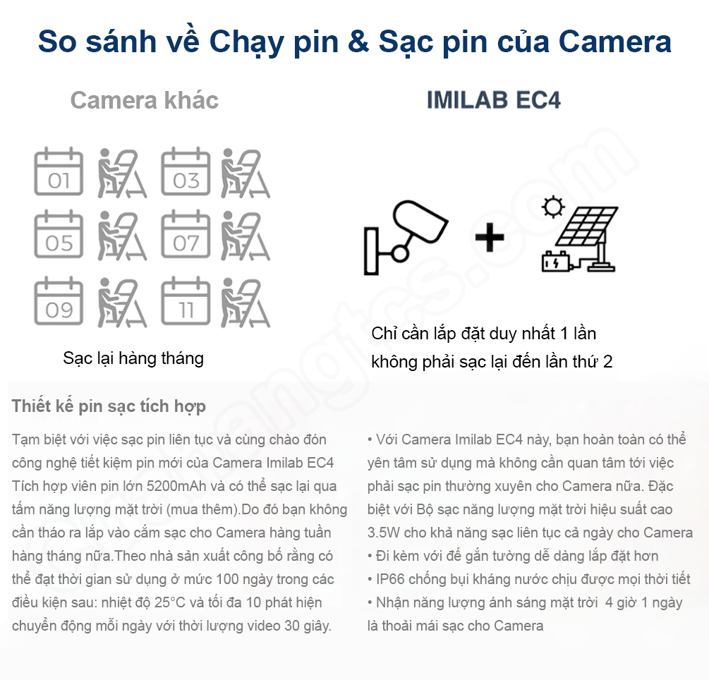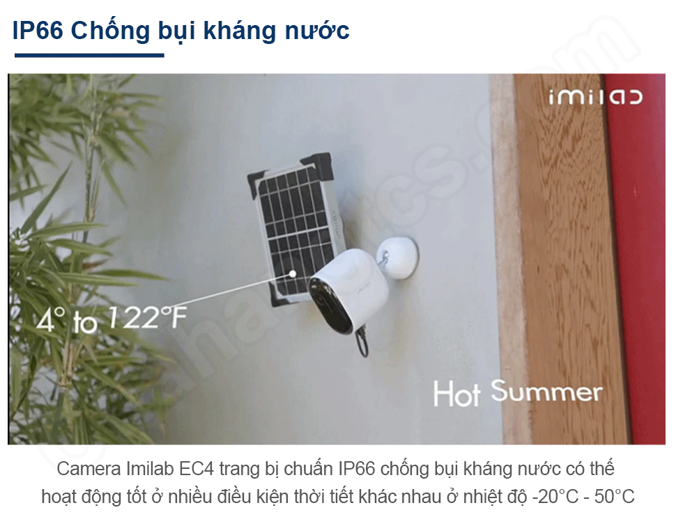 Ngoài việc sử dụng pin là nguồn năng lượng chính thì Camera Xiaomi Imilab EC4 còn có khả năng hoạt động bằng năng lượng mặt trời (mua rời không đi kèm với bộ sản phẩm) , người dùng có thể trang bị thêm mà không phải sử dụng đến nguồn điện trực tiếp. Mặt khác, camera cũng được nhà sản xuất tích hợp chuẩn chống nước IP66, đảm bảo tính ổn định và độ bền ở mọi điều kiện thời tiết.