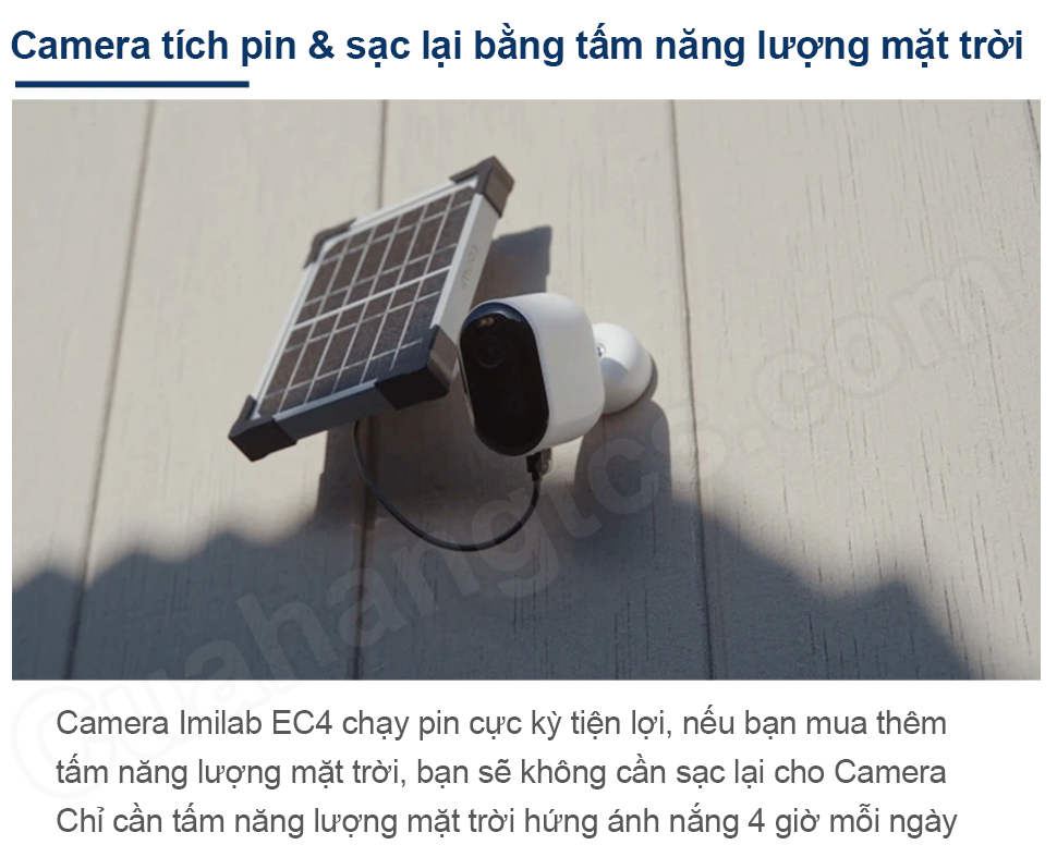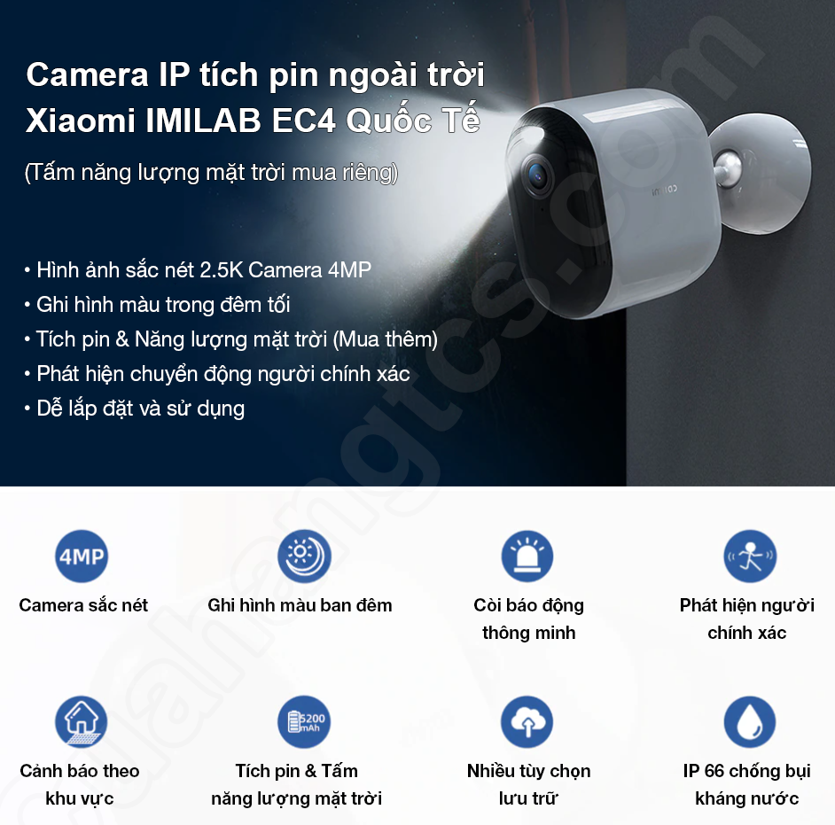 Camera outdoor IMILAB EC4 là camera giám sát ngoài trời có khả năng nhìn ban đêm có màu, có độ phân giải 2.5k, được tích pin nên không cần có nguồn điện, có thể tích hợp tấm năng lượng mặt trời để không phải sạc lại.