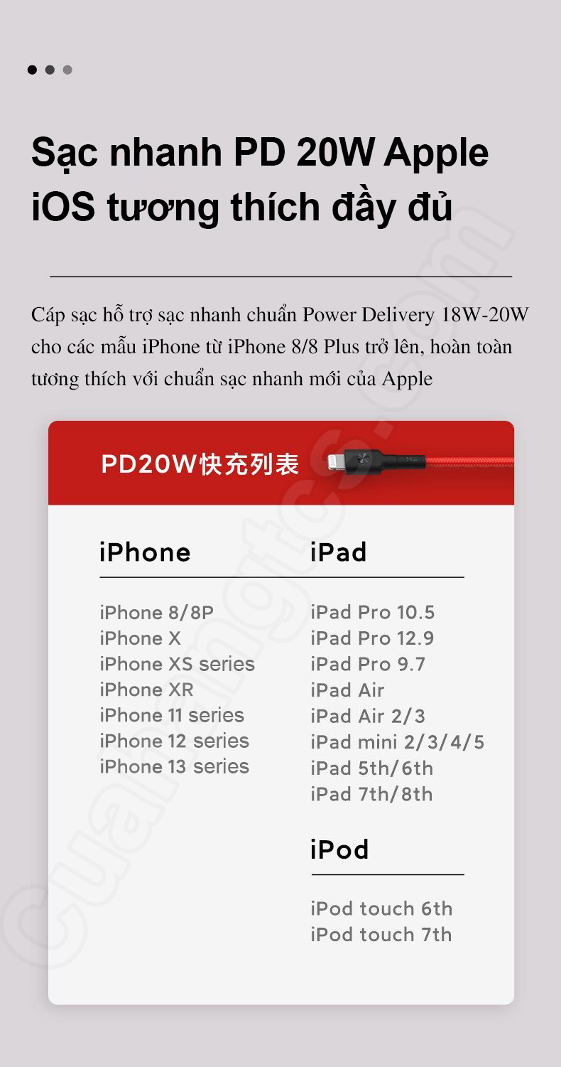 Cụ thể, thiết bị hỗ trợ sạc hoặc truyền dữ liệu từ Iphone 8, 8 plus, X, XS, Macbook Air 13, Macbook Pro 13/15, iPad Pro 11 inch, iPad 12.9 inch,… hay toàn bộ những thiết bị hỗ trợ giao thức USB Type C sang cổng Lightning ( iPhone 5 trở gen 5 trở lên, iPod nano gen 7, iPod touch gen 5/6,… )