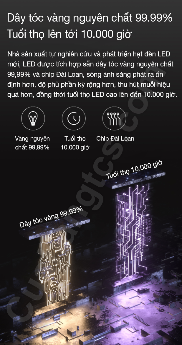 Không giống như các loại đèn khác trên thị trường dùng sợi dây điện bằng hợp kim đồng và bạc, đèn bắt muỗi đa năng sử dụng sợi dây bằng vàng nguyên chất 99.99% cùng chip Đài Loan để tạo ra các hạt đèn LED chất lượng cao với tuổi thọ lên tới 10.000 giờ, cho khả năng làm việc tốt hơn và giúp tăng tuổi thọ của sản phẩm.