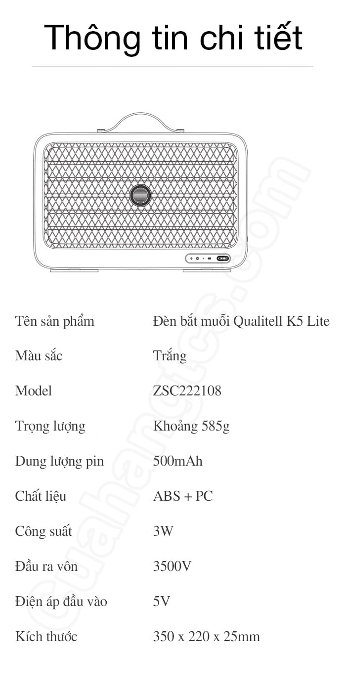 Đèn bắt muỗi Qualitell K5 lite ZSC222108 là một giải pháp hiệu quả để kiểm soát và loại bỏ muỗi trong môi trường sống của chúng ta. Với công nghệ tiên tiến, thiết bị này được thiết kế để hấp dẫn và tiêu diệt muỗi một cách hiệu quả, mang lại không gian sống trong lành và thoải mái cho gia đình.