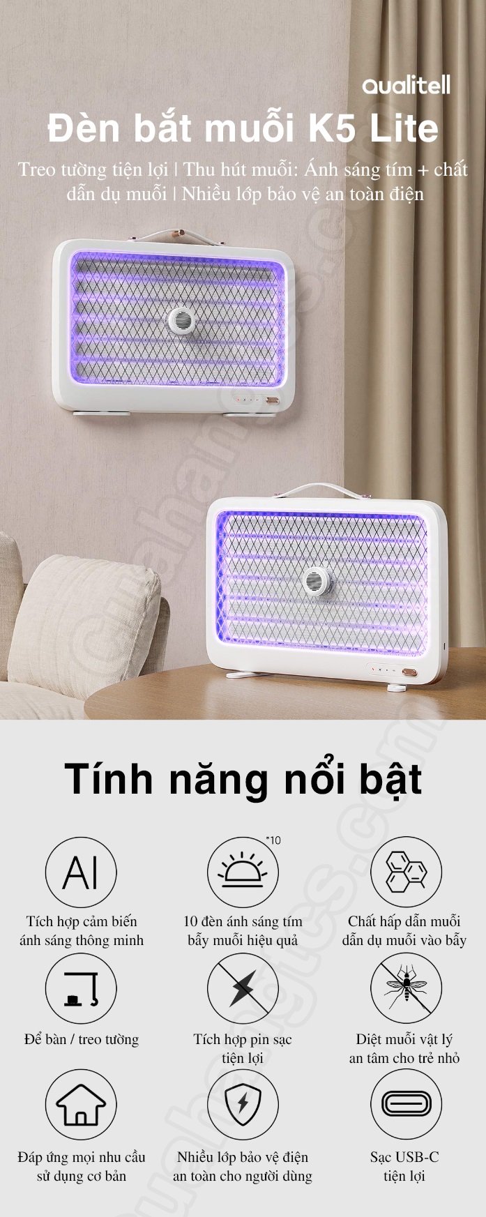Đèn bắt muỗi Qualitell K5 Lite cổng sạc type-C tiện lợi