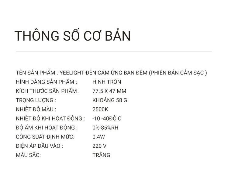 Thông số chi tiết đèn ngủ cảm biến Yeelight YLYD03YL: