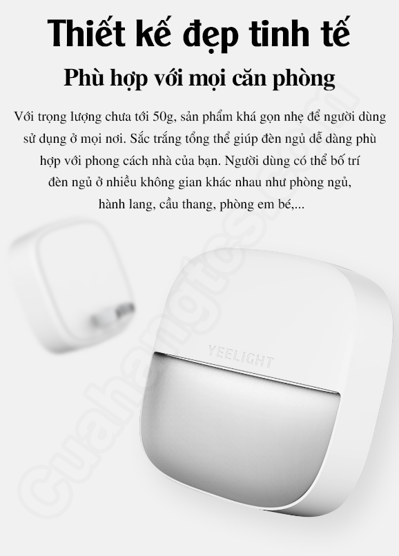 Với trọng lượng chưa tới 50g, sản phẩm khá gọn nhẹ để người dùng sử dụng ở mọi nơi. Sắc trắng tổng thể giúp đèn ngủ dễ dàng phù hợp với phong cách nhà của bạn. Người dùng có thể bố trí đèn ngủ ở nhiều không gian khác nhau như phòng ngủ, hành lang, cầu thang, phòng em bé,…