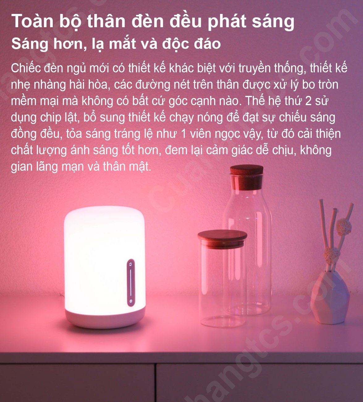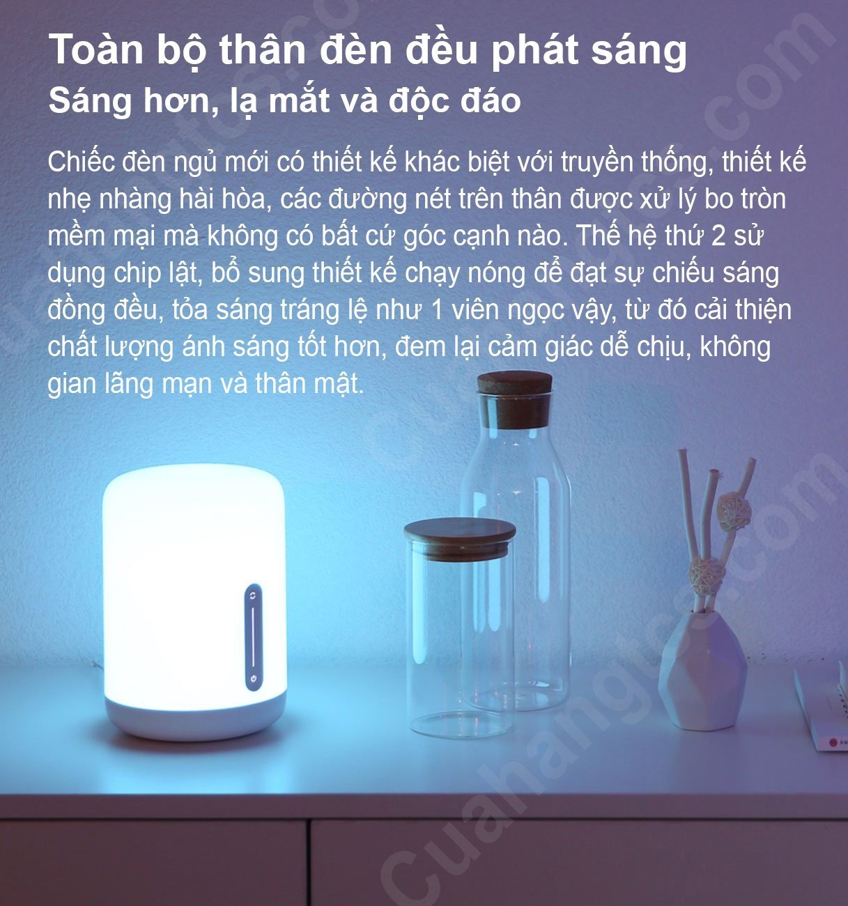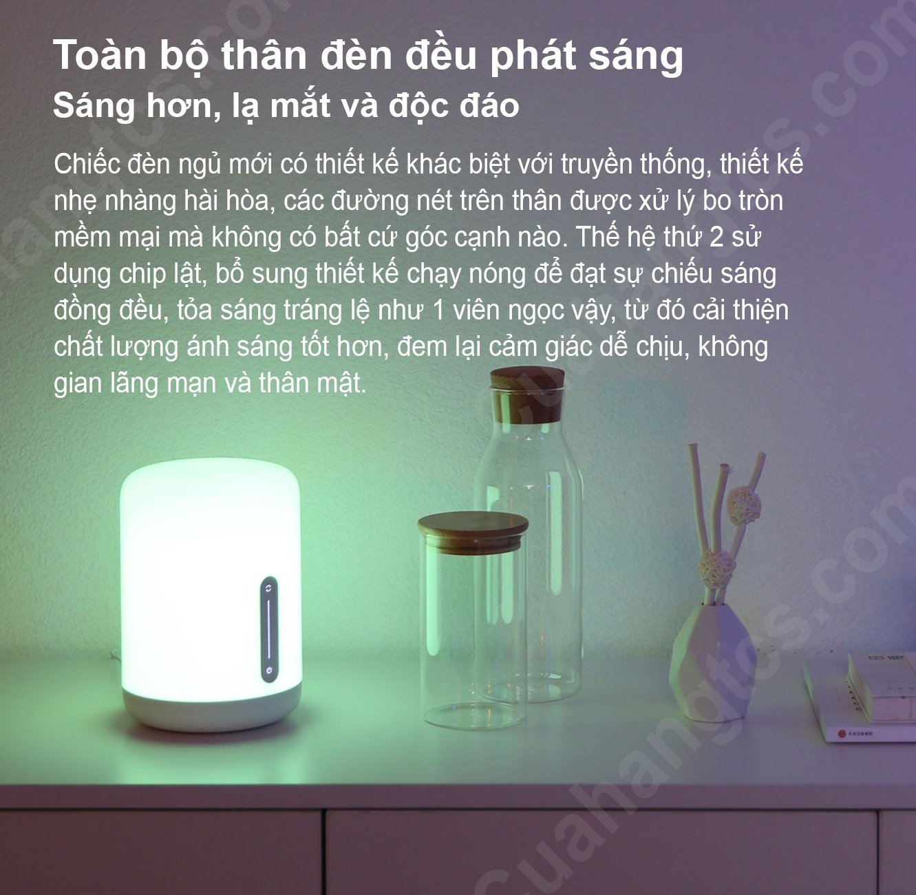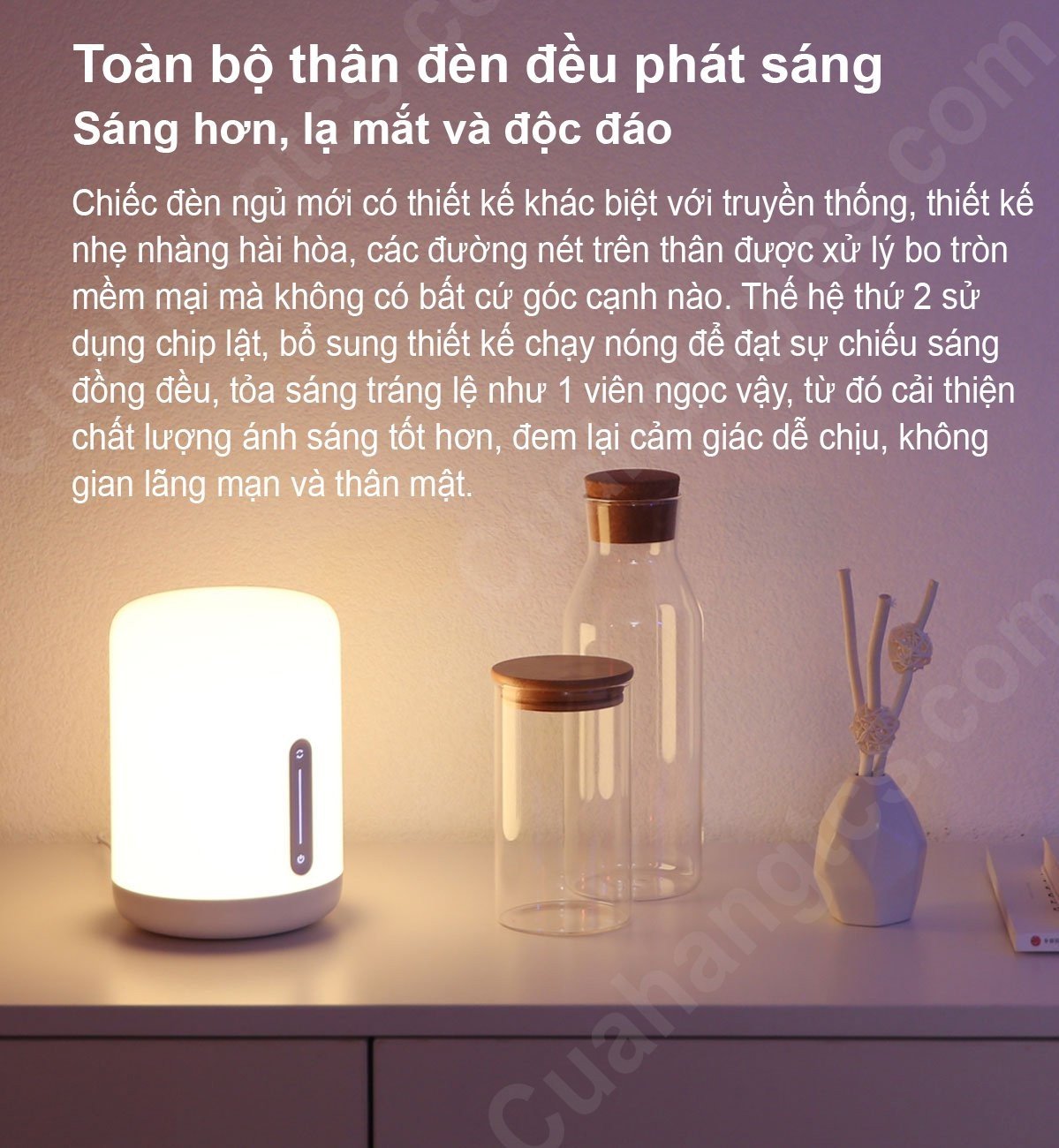 So với người anh tiền nhiệm Mijia Bedside Lamp, đèn ngủ Mijia gen 2 có thiết kế mới lạ mắt hơn với phần thân hình trụ tròn. Đế đèn được làm giảm để nhường chỗ cho chụp đèn, tăng hiệu quả chiếu sáng rộng hơn. Thế hệ thứ 2 còn sử dụng chip lật, bổ sung thiết kế chạy nóng để đạt mức chiếu sáng đồng đều. Từ đó cải thiện chất lượng ánh sáng tốt hơn, đem lại cảm giác dễ chịu cho người dùng.