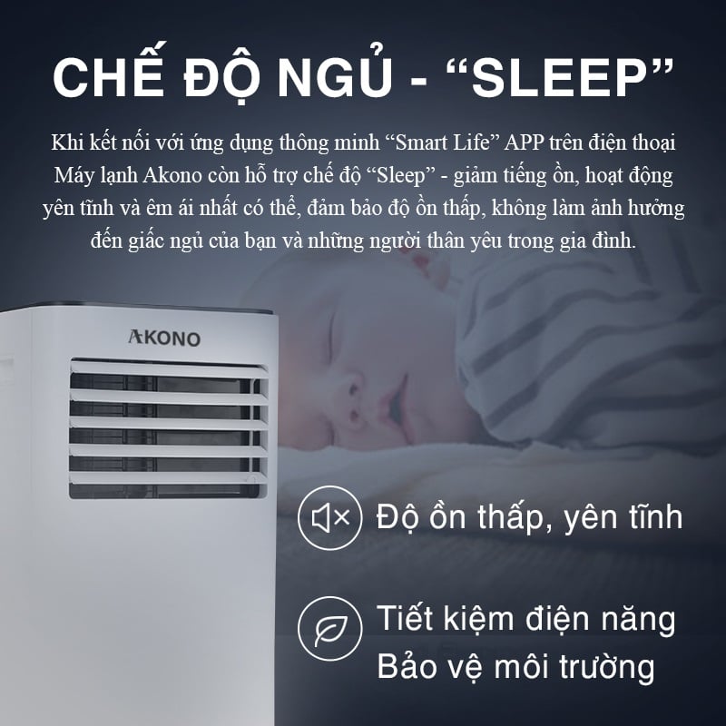 Khi kết nối với ứng dụng thông minh trên điện thoại app ”smart life”, máy lạnh akono còn hỗ trợ thêm chế độ ”sleep”- giảm tiếng ồn, hoạt động yên tính và êm ái nhất có thể, đàm bảo độ ồn thấp, không làm ảnh hưởng đến giấc ngủ của bạn và những người thân yêu trong gia đình.