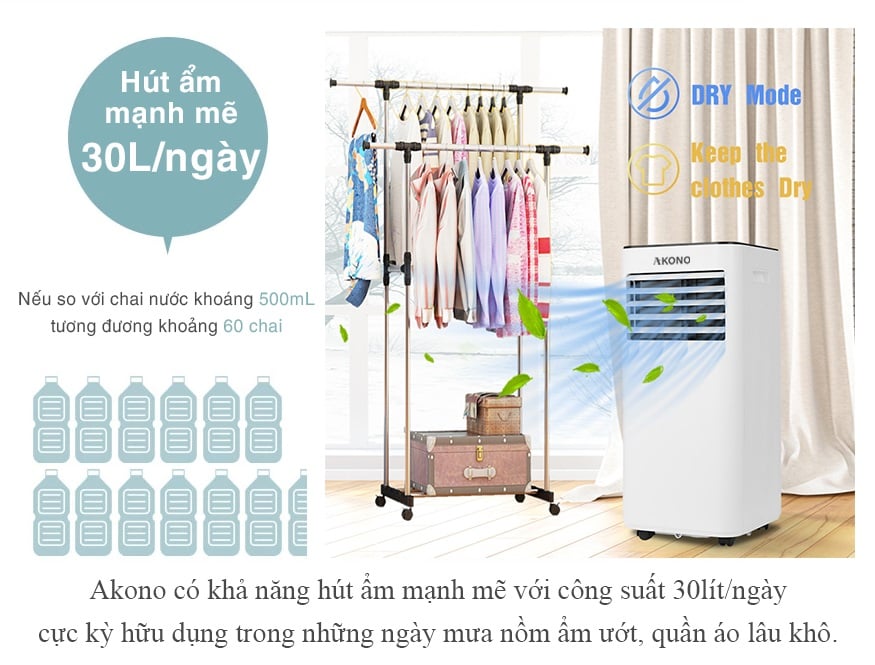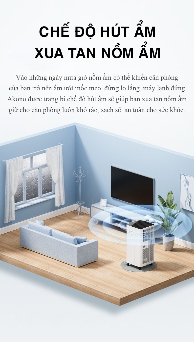 Không khí ẩm gây nên các mùi hôi ẩm mốc khó chịu, lâu dần làm ảnh hưởng đến đồ dùng nội thất trong nhà cũng như tác động nghiêm trọng đến tình trạng sức khỏe của cả gia đình. Máy lạnh đứng Akono cũng sẽ là 1 giải pháp thiết thực cho gia đình bạn trong những ngày nồm, với khả năng hút ẩm mạnh mẽ 30l/ngày, sẽ hút được khoảng 60 chai nước khoáng 1 ngày.