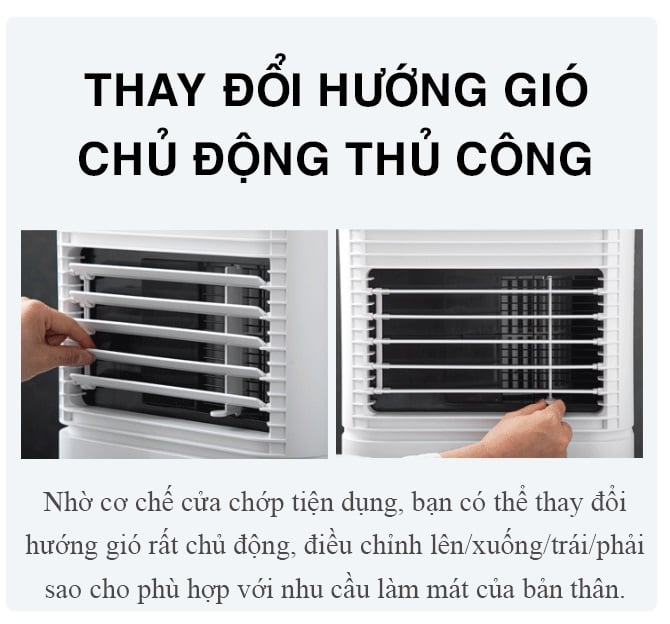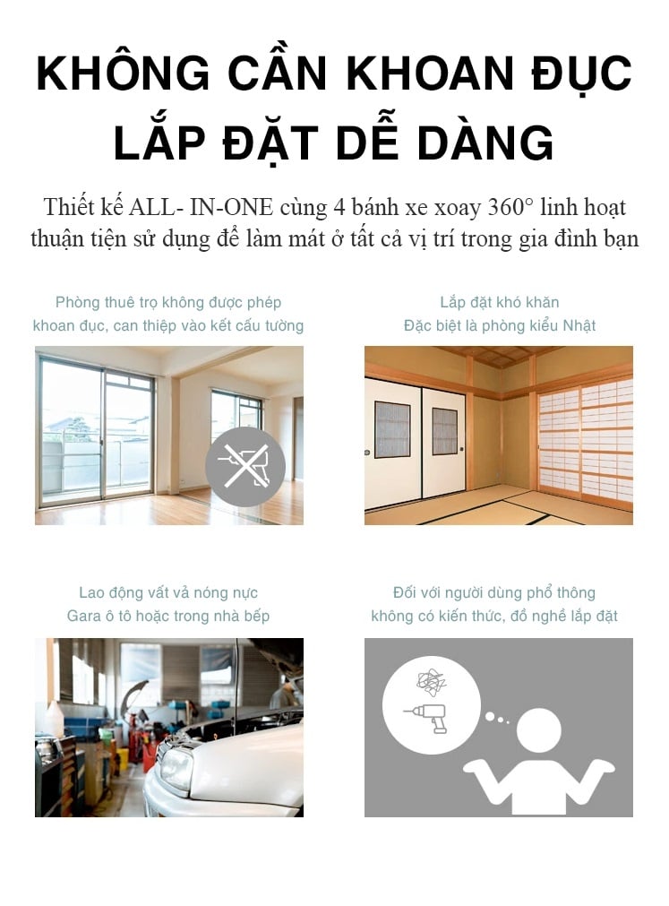 > Bánh xe xoay 360 độ dễ dàng thay đổi vị trí đặt điều hòa (điều mà máy lạnh truyền thống không thể làm)