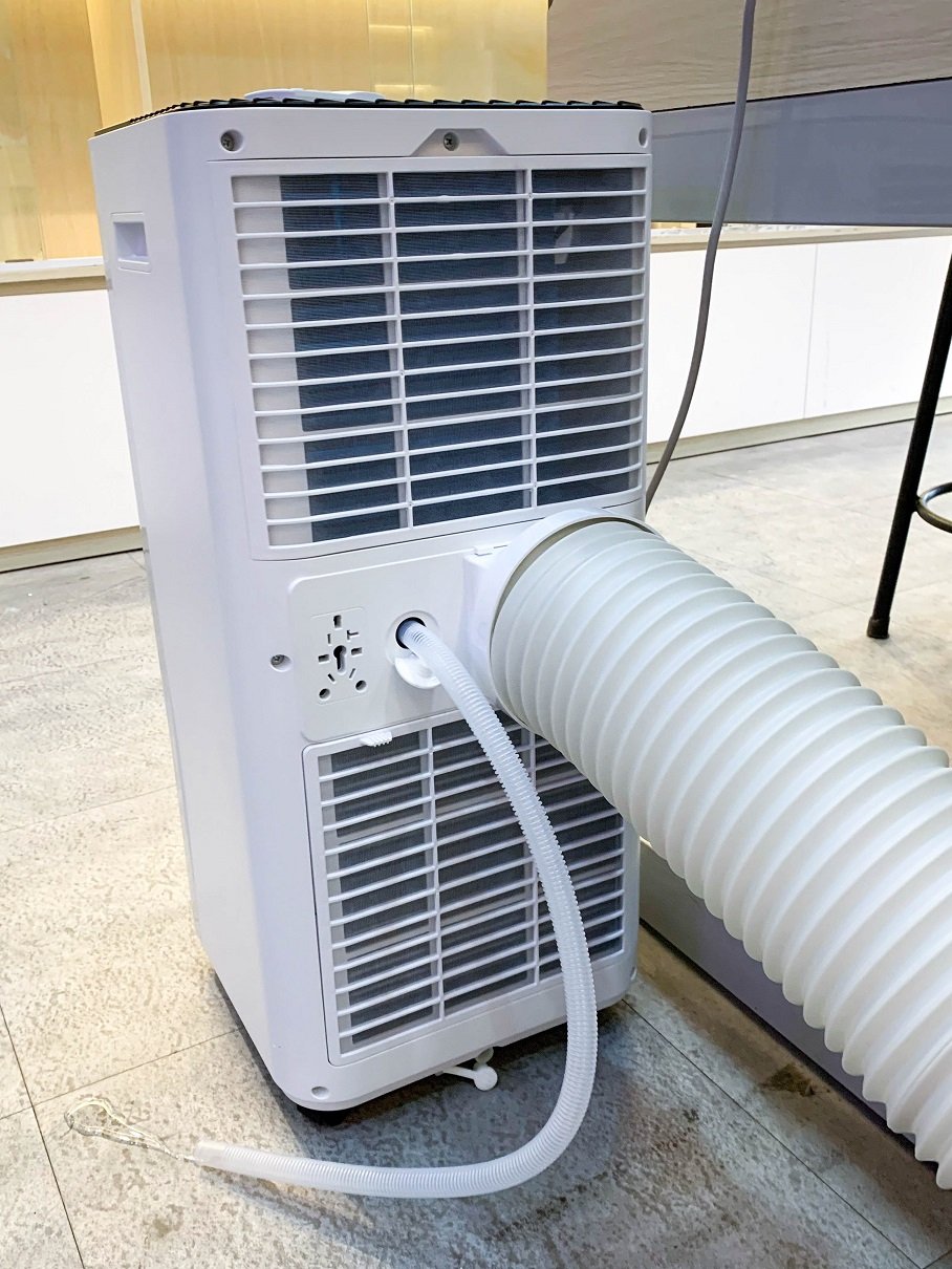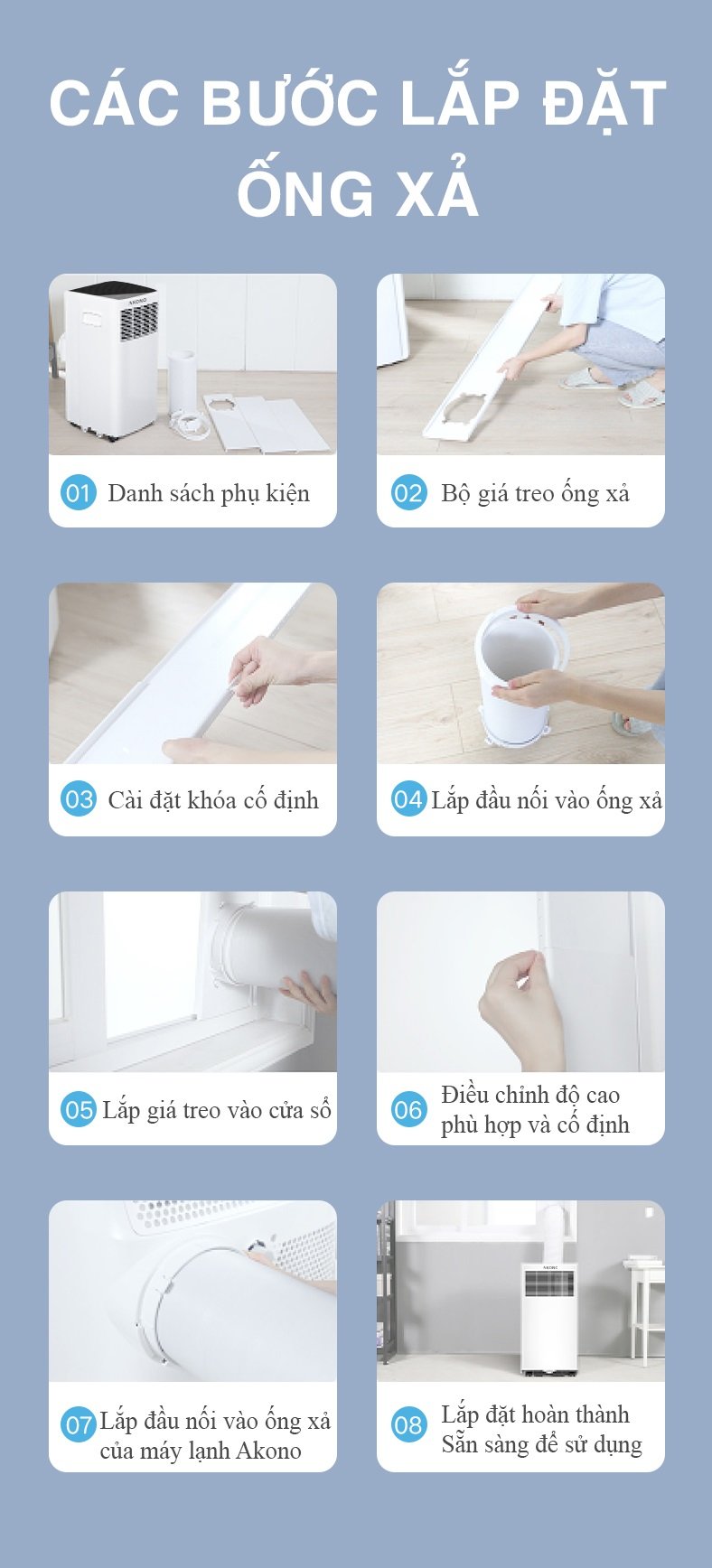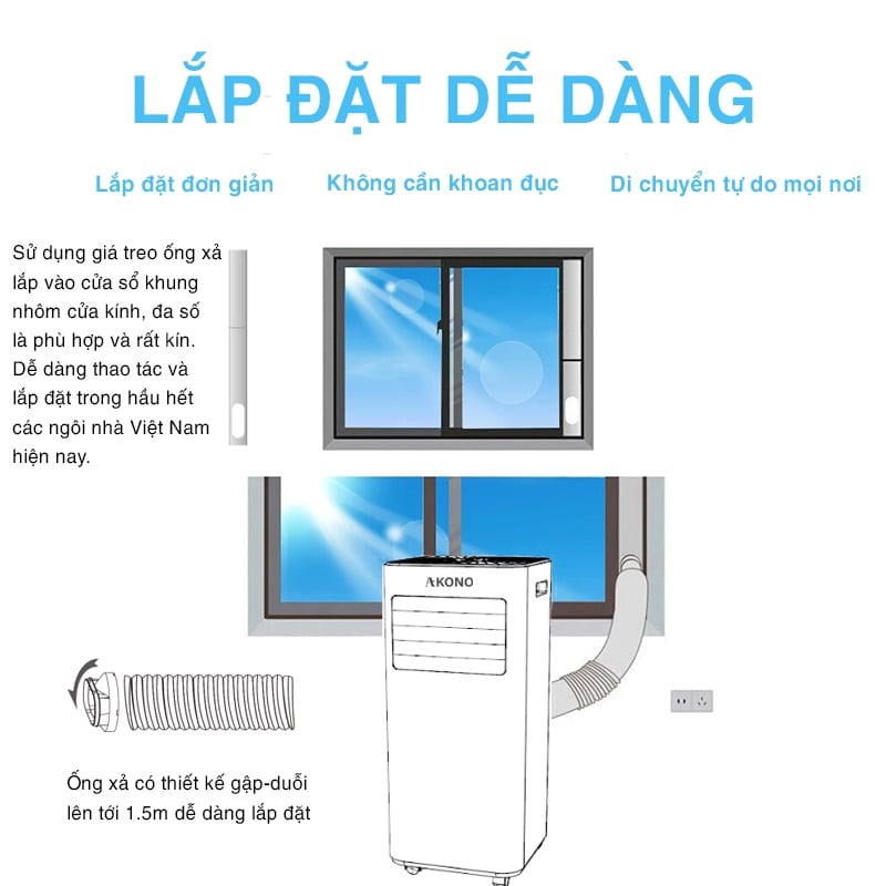Akono AK084DMS sử dụng cơ chế thoát hơi nóng thông qua 1 ống sau lưng, sử dụng giá treo ống xả đi kèm. Bạn mua về, chỉ cần đặt cạnh cửa sổ, bật máy chạy là có thể dùng, vô cùng dễ dàng, không cần khoan đục đi ống đồng phức tạp.