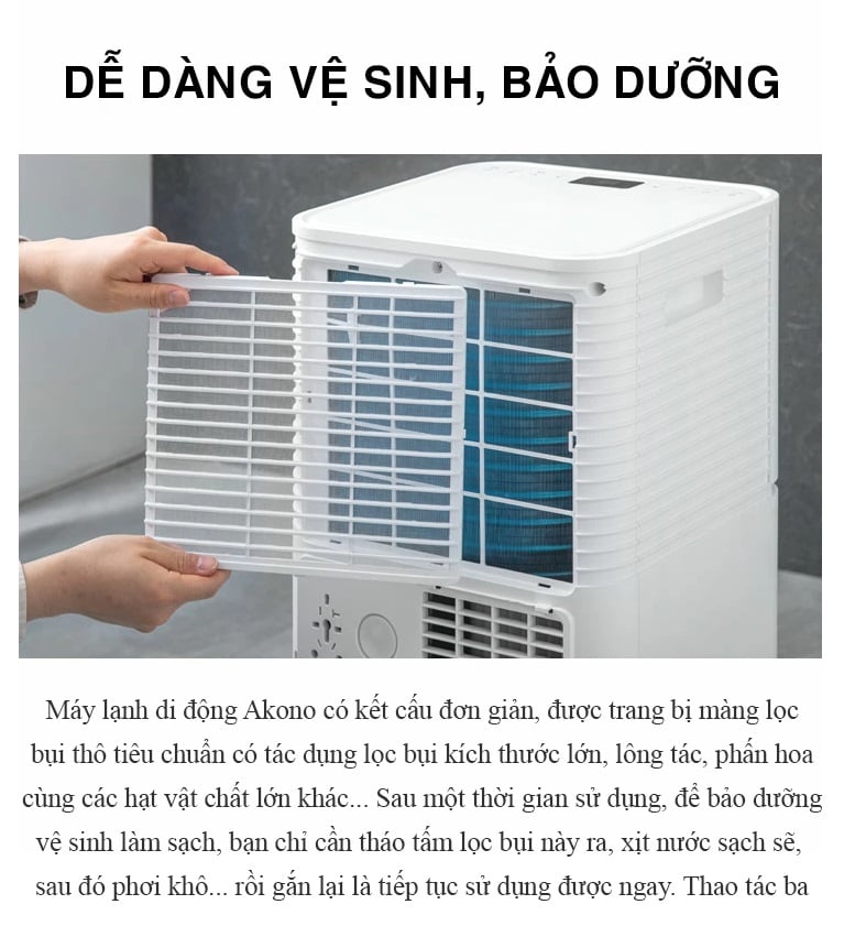 Máy lạnh đứng Akono có kết cấu đơn giản, được trang bị màng lọc bụi thô tiêu chuẩn có tác dụng loại bỏ bụi, lông động vật, phấn hoa…Sau 1 thời gian sử dụng, chỉ cần nhấc ra xịt nước phơi khô là có thể tiếp tục sử dụng được ngay.