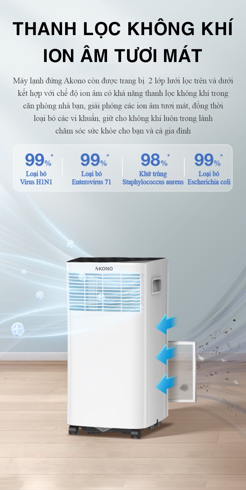 Máy lạnh đứng Akono trang bị 2 lớp lưới lọc cao cấp trên và dưới kết hợp với bộ tạo ion âm cho khả năng lọc không khí tuyệt vời cho phòng bạn. Máy lạnh Akono giải phóng các ion âm giúp 1 phần lọc loại bỏ các vi khuẩn, giữ cho không khí luôn trong lành, chăm sóc sức khỏe cho bạn và gia đình.