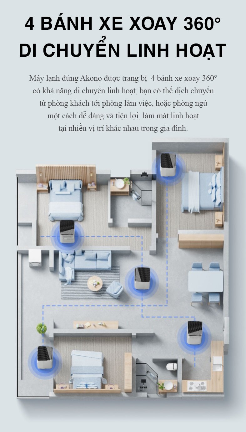 Akono Portable Air Conditioner được trang bị 4 bánh xe xoay 360 độ, có khả năng di chuyển linh hoạt, bạn có thể dễ dàng di chuyển từ phòng khách tới phòng làm việc hoặc phòng ngủ, dễ dàng làm mát nhiều vị trí trong nhà, 1 tính năng mà máy lạnh truyền thống không thể làm được.