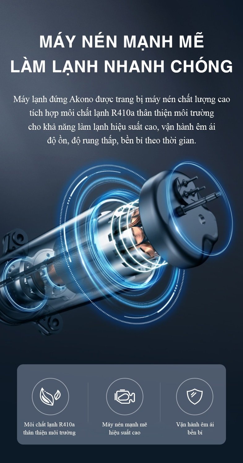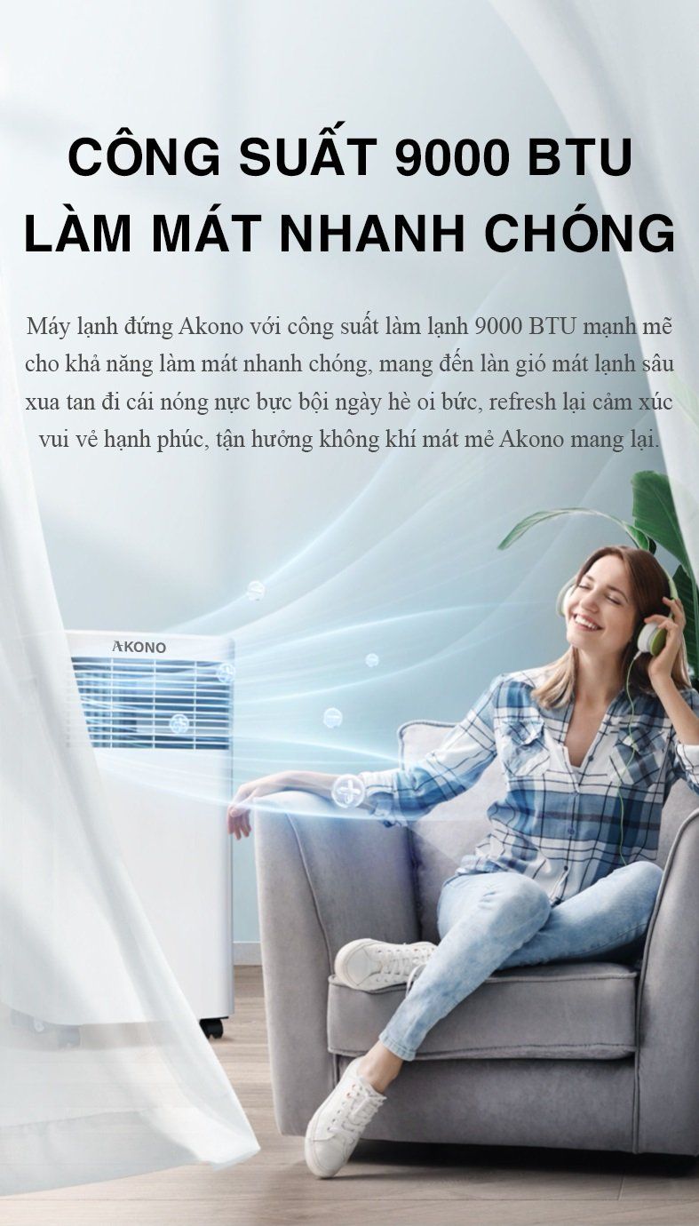 Máy lạnh đứng Akono với công suất làm lạnh 9000 BTU mạnh mẽ cho khả năng làm mát nhanh chóng, mang đến làn gió mát lạnh sâu xua tan đi cái nóng nực bực bội của ngày hè oi bức, refresh lại cảm xúc vui vẻ hạnh phúc, tận hưởng không khí mát mẻ Akono mang lại.