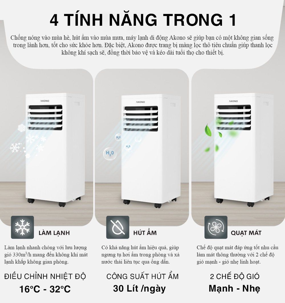 Ngoài tính năng của một máy lạnh truyền thống thì Máy lạnh đứng Akono AK084DMS còn có thể là 1 chiếc máy hút ẩm (khả năng hút ẩm 30l/ ngày), có thể là 1 chiếc quạt thông thường với 2 chế độ gió mạnh và nhẹ hay còn có thể làm 1 chiếc máy lọc không khí với công nghệ tạo ion âm cao cấp. Nhờ đó, máy lạnh di động Akono sẽ giúp nâng cao chất lượng sức khỏe gia đình bạn dù là mùa nóng hay mùa lạnh.