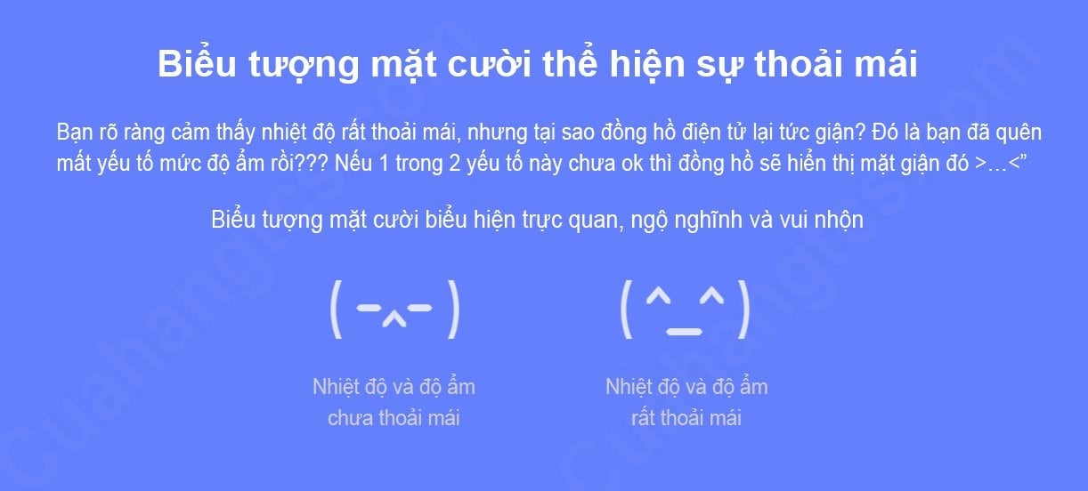 Đồng hồ tích hợp 2 icon ngộ nghĩnh, nếu bạn ở trong 1 môi trường có icon tức giận, có nghĩa là nhiệt độ và độ ẩm kém, ngược lại icon vui có nghĩa là nhiệt độ và độ ẩm rất phù hợp. Các icon trực quan và ngộ nghĩnh giúp người dùng dễ hiểu hơn.