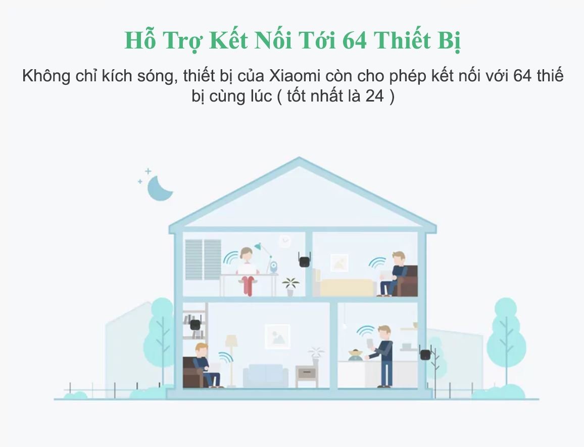 Với thiết bị kích sóng wifi Xiaomi Repeater Pro, 64 thiết bị có thể bắt sóng và sử dụng cùng lúc. Tất nhiên, càng nhiều thiết bị kết nối thì tốc độ truyền dữ liệu sẽ càng chậm đi, nên nhà sản xuất khuyến khích chỉ nên kết nối cùng lúc 24 thiết bị là thích hợp nhất.