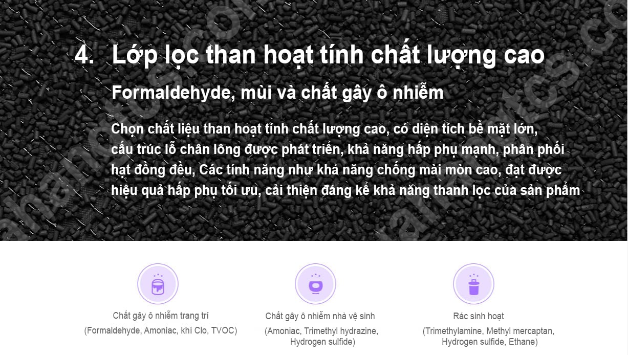 Bên cạnh đó, lõi lọc Formaldehyde còn được thiết kế một lớp lọc muối hữu cơ kim loại giúp ngăn chặn vi khuẩn, nấm mốc và mùi hôi khó chịu. Lớp than hoạt tính đặt giữa các lớp lọc sẽ giúp loại bỏ chất formaldehyde, TVOC, cũng như những tạp chất có hại khác trong không khí. Với đặc điểm các nhà máy, xí nghiệp ồ ạt mọc lên và thải ra hàng tấn chất bẩn như hiện nay, thì thiết kế của chiếc lõi lọc này là vô cùng phù hợp giúp đảm bảo một bầu không khí trong lành cho gia đình bạn.