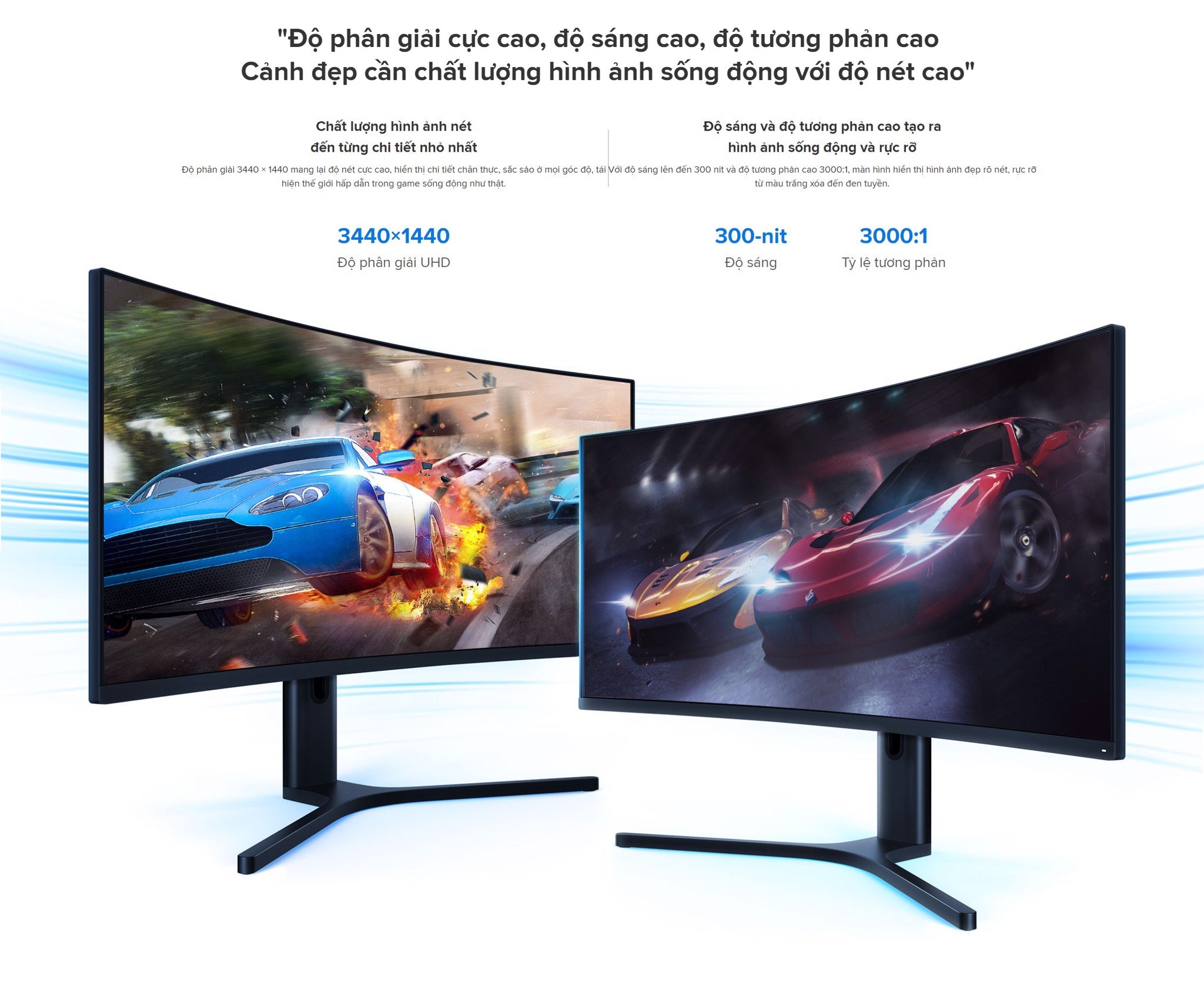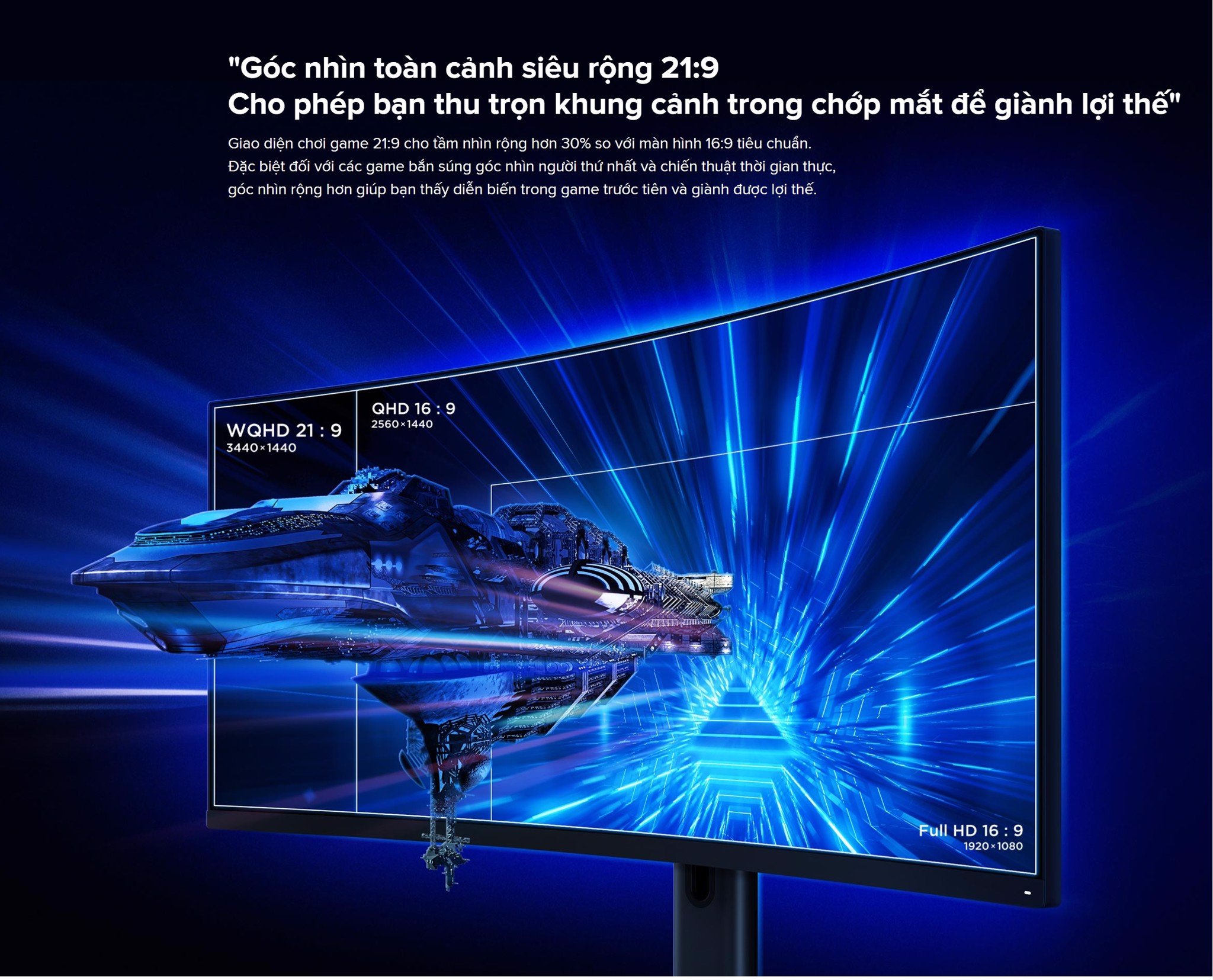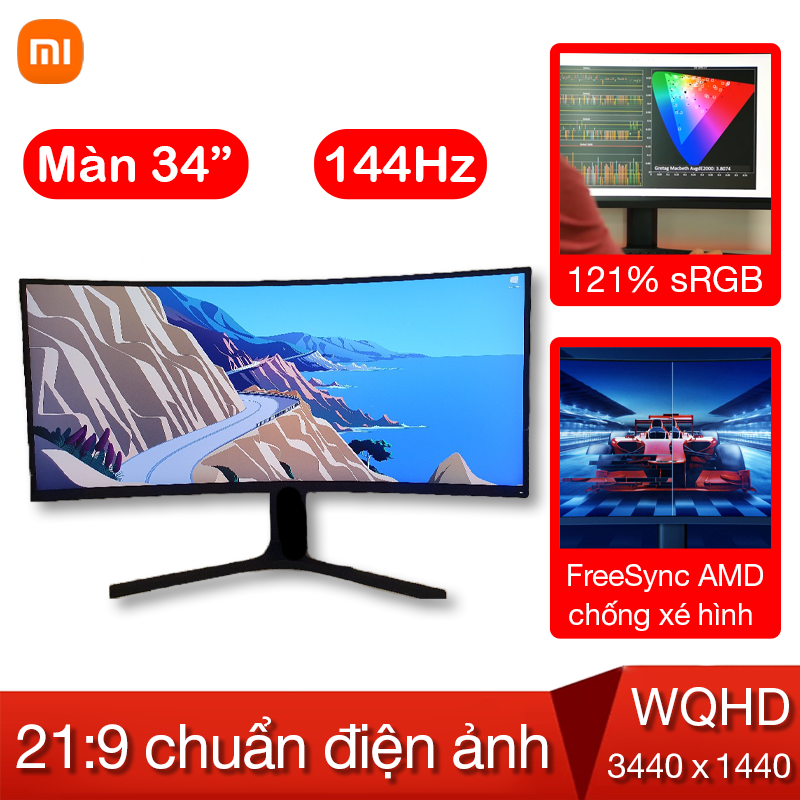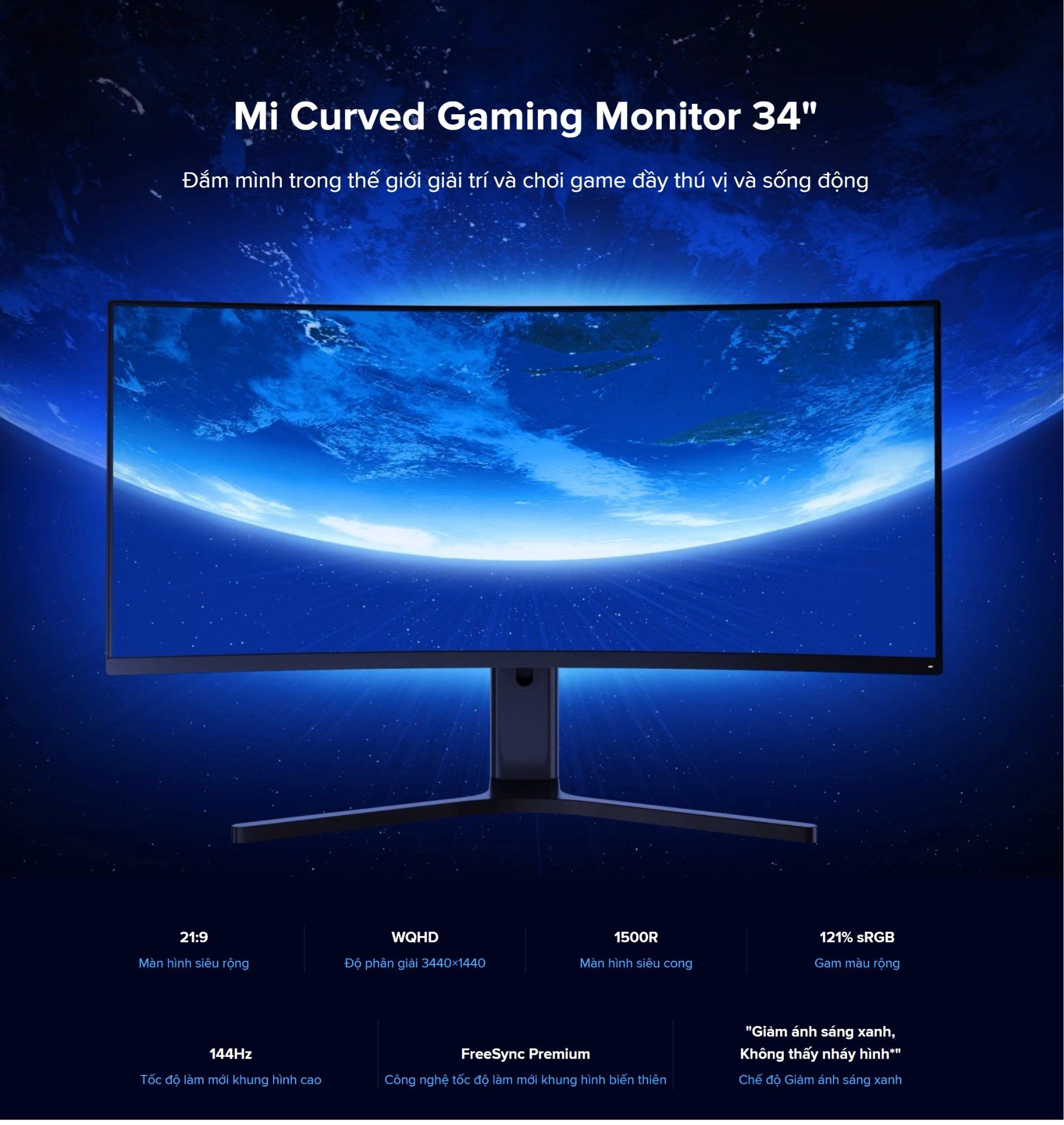 Màn hình Xiaomi Mi Gaming Monitor 34 inch quốc tế với thiết kế độ cong lên đến 1500R, tần số quét 144hz, độ nét cao 3440x1440p, tỉ lệ màn hình WQHD 21:9, công nghệ chống xé hình cao cấp free sync premium