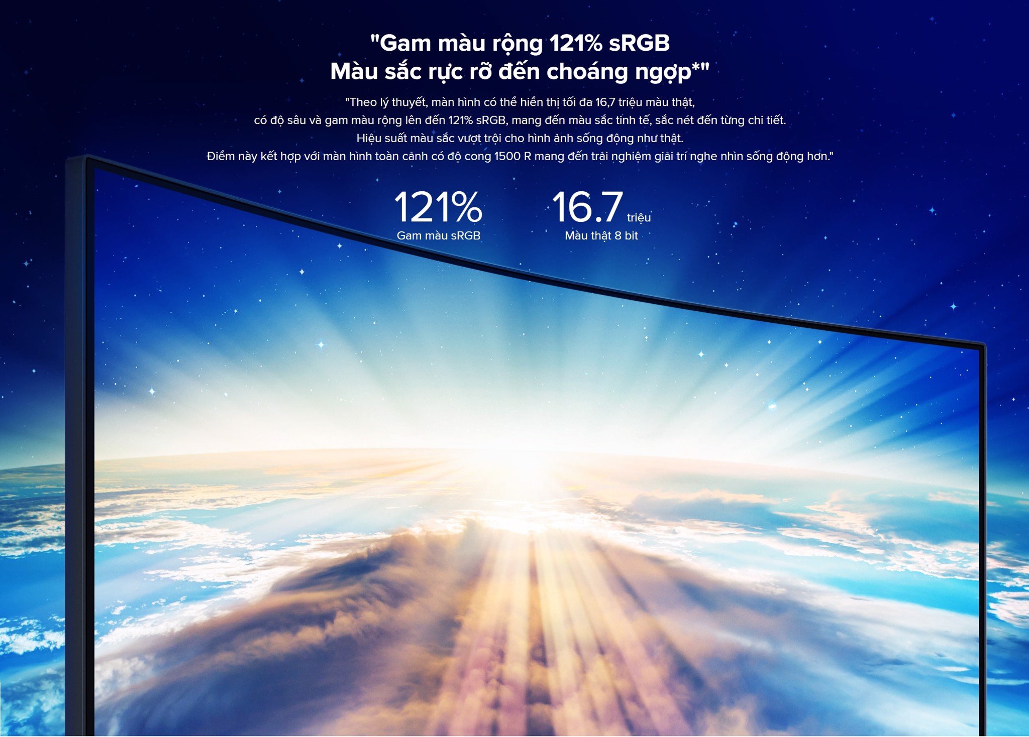 Màn hình có thể hiển thị tối đa theo lý thuyết là 16,7 triệu màu trung thực với độ sâu màu phong phú và gam màu rộng lên đến 121% sRGB hiển thị màu sắc tinh tế với chi tiết sống động. Hiệu suất màu sắc vượt trội, tạo ra hình ảnh sống động như thật. Điều này kết hợp với màn hình toàn cảnh cong 1500R, để mang đến trải nghiệm giải trí và chân thật