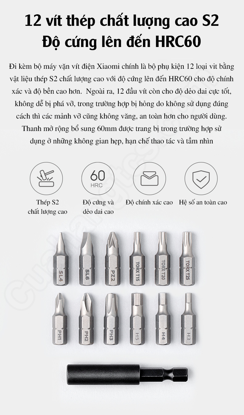 Đi kèm bộ máy vặn vít điện Mijia chính là bộ phụ kiện 12 loại vit bằng vật liệu thép S2 chất lượng cao với độ cứng lên đến HRC60 cho độ chính xác và độ bền cao hơn. Ngoài ra, 12 đầu vít còn cho độ dẻo dai cực tốt, không dễ bị phá vỡ, trong trường hợp bị hỏng do không sử dụng đúng cách thì các mảnh vỡ cũng không văng, an toàn hơn cho người dùng. Thanh mở rộng bổ sung 60mm được trang bị trong trường hợp sử dụng ở những không gian hẹp, hạn chế thao tác và tầm nhìn.