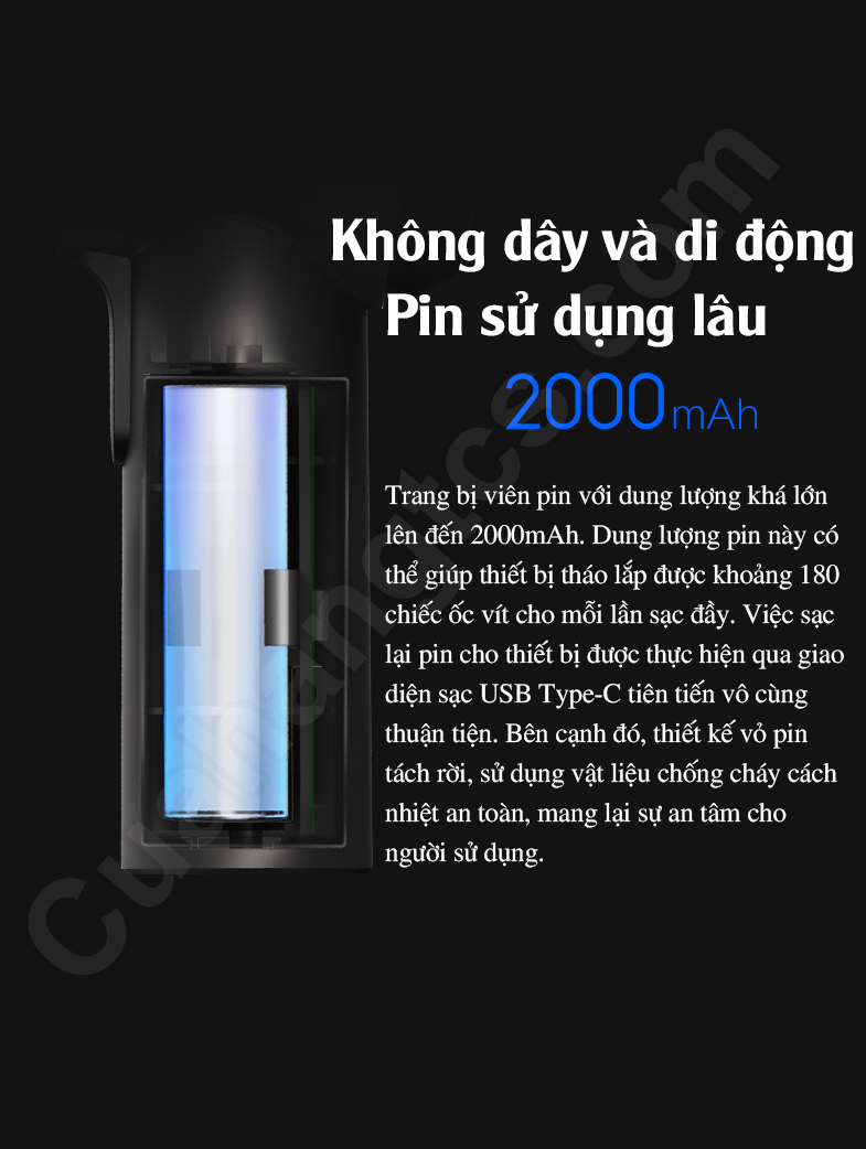 Các loại máy bắn vít truyền thống thường hoạt động nhờ năng lượng điện cắm trực tiếp nên sẽ rất hạn chế trong việc di chuyển. Máy bắn vít điện Mijia MJDDLSD001WQ được trang bị viên pin với dung lượng khá lớn lên đến 2000mAh. Dung lượng pin này có thể giúp thiết bị tháo lắp được khoảng 180 chiếc ốc vít cho mỗi lần sạc đầy. Việc sạc lại pin cho thiết bị được thực hiện qua giao diện sạc USB Type-C khá phổ biến, chính vì thế người dùng hoàn toàn có thể tận dụng và sử dụng những bộ sạc smartphone có sẵn, để sạc cho chiếc máy bắn vít này.