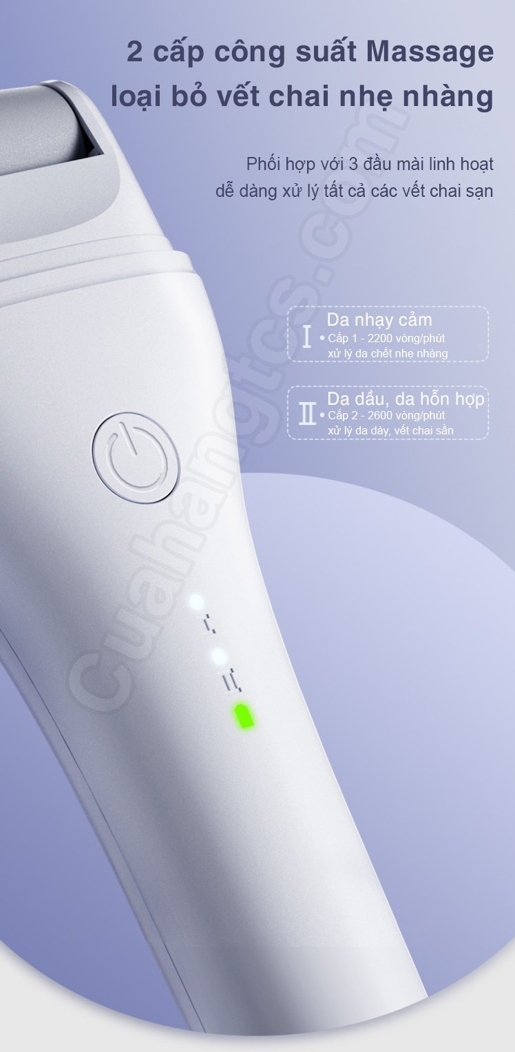 > 2 chế độ làm việc: Hai bánh răng trợ lực và ba đầu mài có thể xử lý mọi loại vết chai. Chế độ 1: Giải quyết da sừng hóa nhẹ, Chế độ 2: Giải quyết các vết nứt dày trên da.