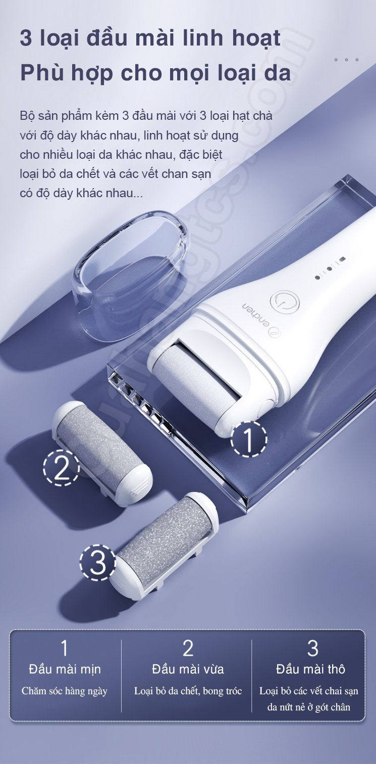 Xiaomi Enchen Rock có tới 3 đầu mài được làm bằng vật liệu nhám chọn lọc, có khả năng chống mòn và chịu lực tốt, giúp tẩy tế bào chết nhanh chóng hơn. Bên cạnh đó, 3 đầu mài này có thể thay đổi linh hoạt tùy theo mức độ da chết của người sử dụng.