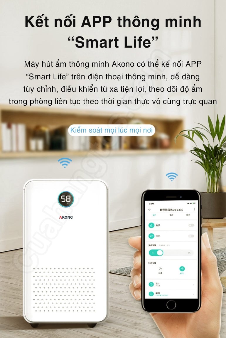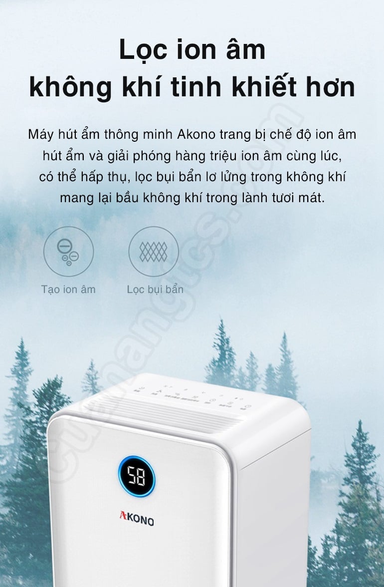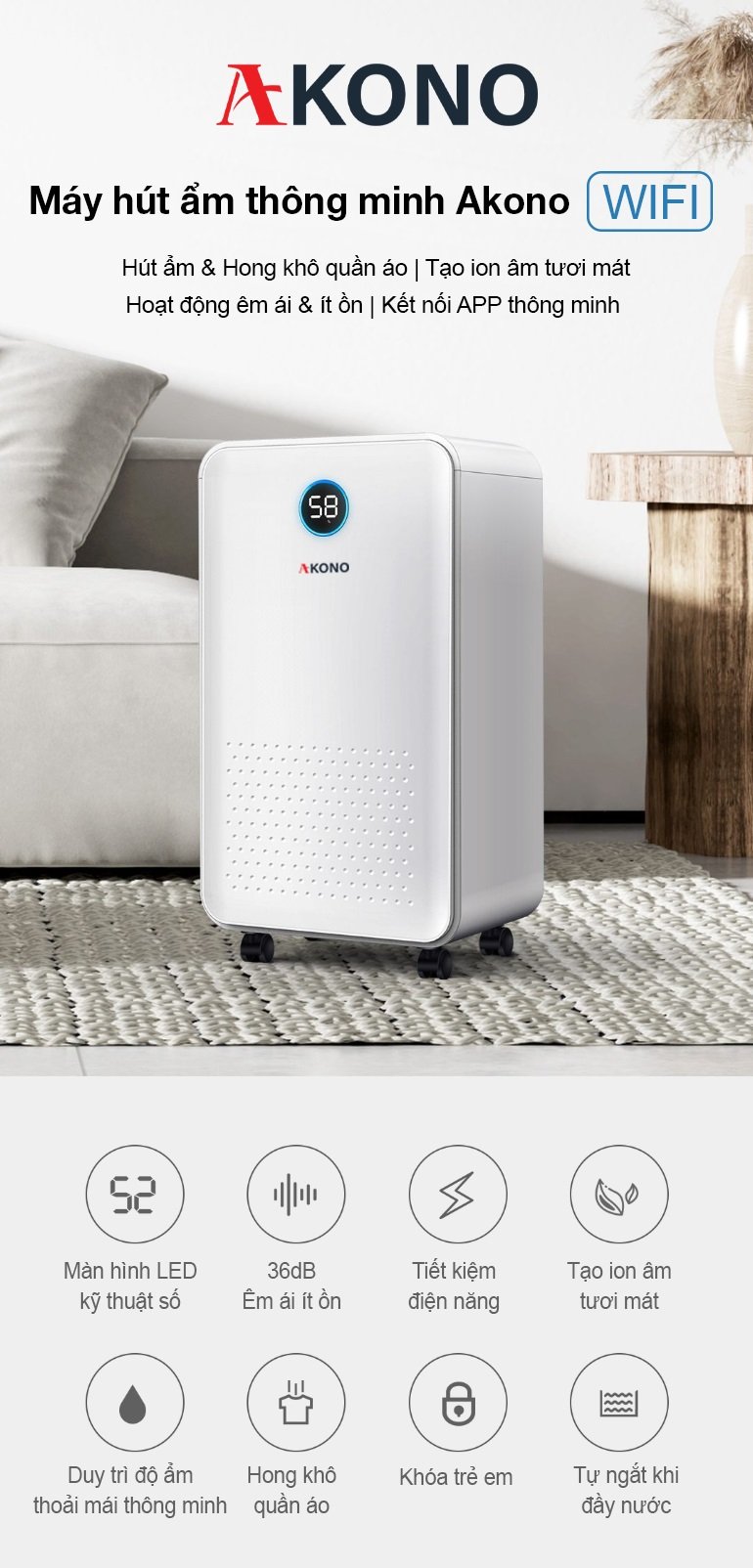 Máy hút ẩm thông minh ion âm Akono 12L với khả năng hút ẩm nhanh 12l/ ngày, điều khiển thông minh qua app, nhiều chế độ làm khô, là người bạn giúp nâng cao sức khỏe gia đình bạn trong những ngày nồm khó chịu.