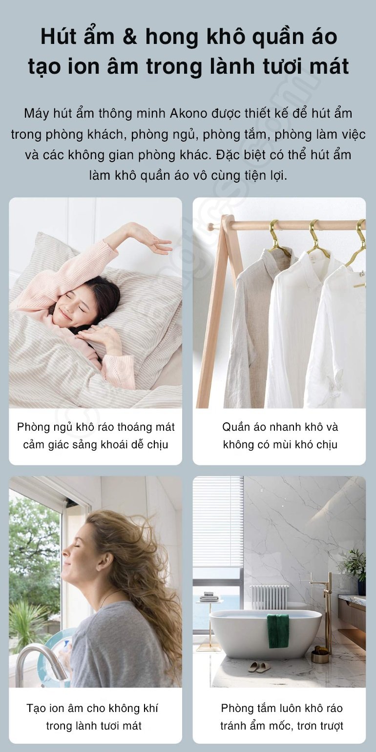 Một tính năng đặc biệt khác không thể không kể đến của máy hút ẩm Akono đó chính là khả năng sấy khô quần áo nhanh chóng, loại bỏ hơi ẩm trên quần áo hiệu quả không khác gì phơi khô bằng ánh nắng mặt trời. Quá trình sấy khô này của máy hút ẩm sẽ không làm ảnh hưởng đến chất liệu và cấu trúc vải của quần áo, đồng thời nó cũng sẽ loại bỏ dễ dàng mùi ẩm mốc khó chịu do quần áo không thể phơi khô khi trời mưa triền miên.