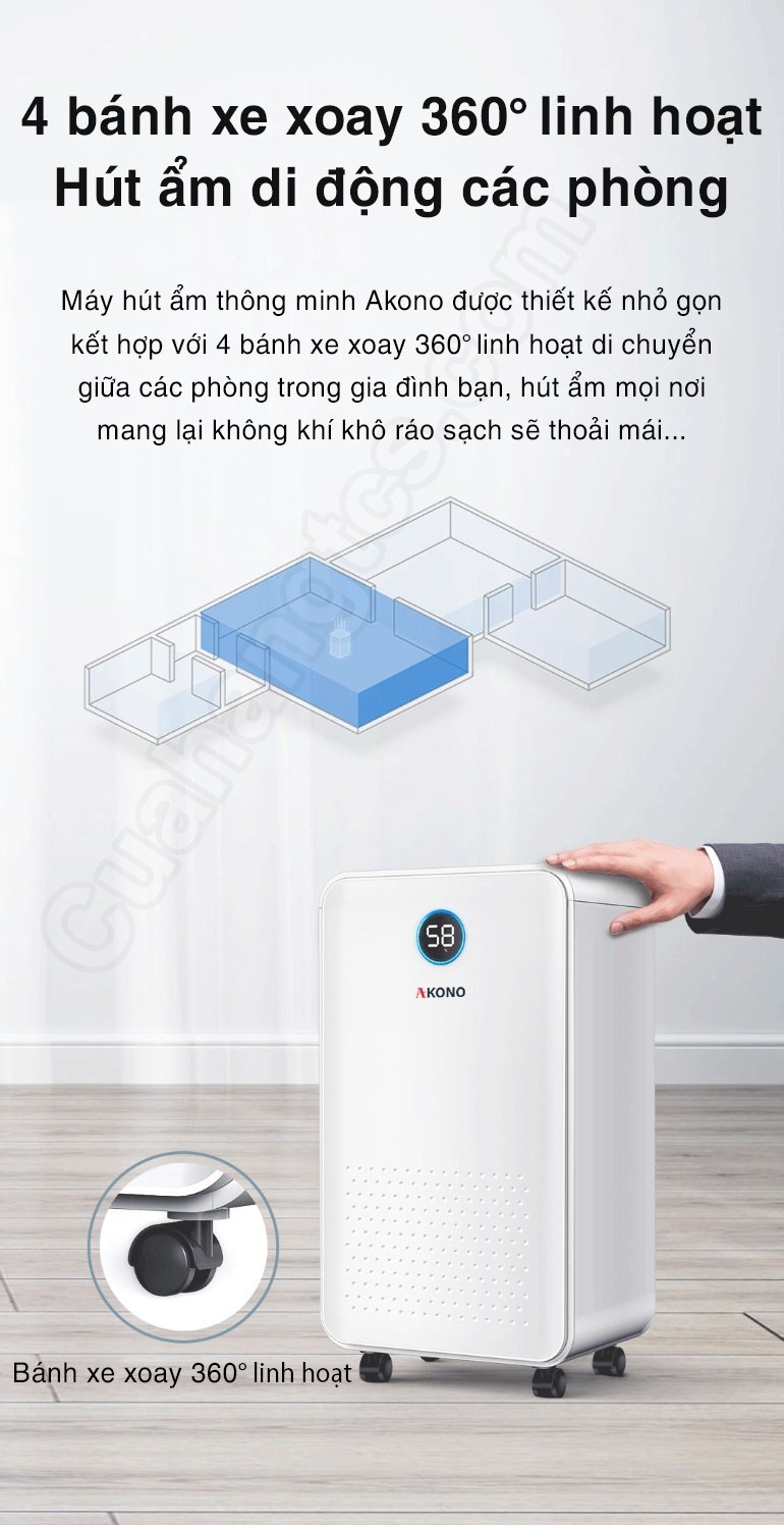 Máy hút ẩm Akono 12L trang bị bốn bánh đa năng không thể lật, dễ di chuyển, chất liệu PA chống mài mòn có tuổi thọ sử dụng trên 100.000 lần. Không gây ảnh hưởng đến gạch lát nền.