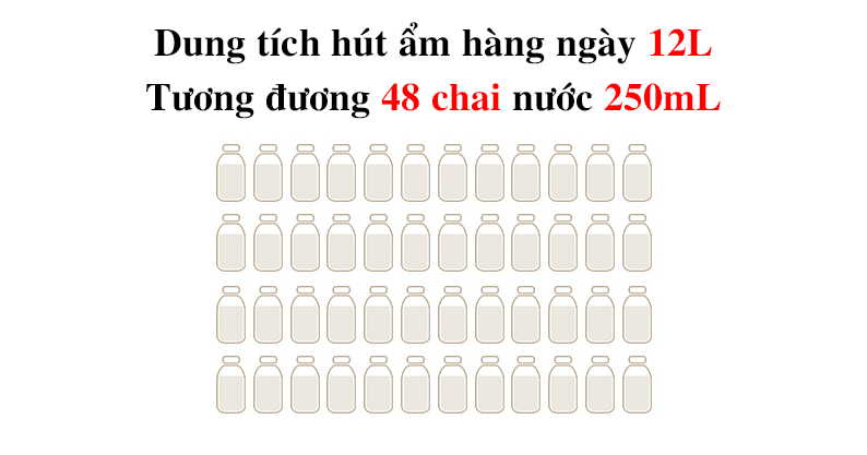 > Công suất hút ẩm 12L mỗi ngày (tương đương 48 chai nước suối 250ml)