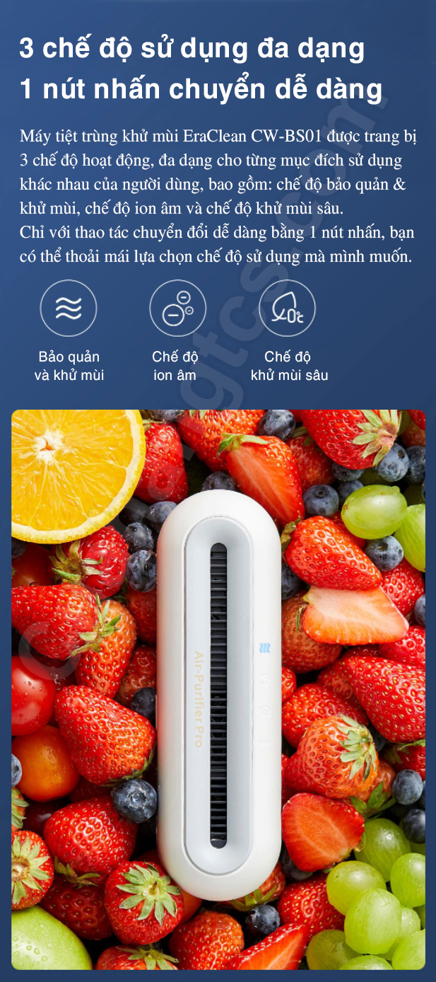 Máy tiệt trùng khử mùi EraClean CW-BS01 được trang bị 3 chế độ hoạt động, đa dạng cho từng mục đích sử dụng khác nhau của người dùng, bao gồm: chế độ làm sạch và khử mùi, chế độ ion âm và chế độ khử mùi sâu. Chỉ với thao tác chuyển đổi dễ dàng bằng một phím, bạn có thể thoải mái lựa chọn chế độ sử dụng mà mình muốn.